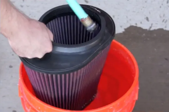 Next use a garden hose, or other low pressure water source and gently rinse the filter from the inside out. Rinsing inside out pushes dirt out of the filter media, do not rinse outside in as it could force dirt deeper into the filter.