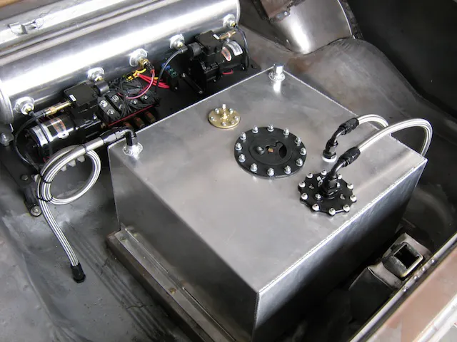 Fuel Pump Location and Positive Pressure: Next, you have to get rid of the pick-up tube set up that just runs through the top of the tank and sucks the fuel out to the pump. There is no scenario where that type of system won’t put negative pressure on the fuel. You have to gravity feed the fuel pump by welding in a sump to create a new low point in the tank to pull fuel from. Also, mount your pump lower than the tank so you have gravity helping to feed your pump, and a positive pressure system. With positive pressure on the system, the fuel can’t turn into vapor, regardless of how hot it gets – even if the fuel was boiling in the tank. Having an in-tank pump works pretty much the same way, because you have a column of fuel above the pump pressing down on it and creating positive pressure, and the benefits of cooling the pump by having it inside the fuel.