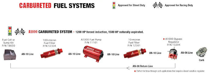 Most fuel system problems have nothing to do with your pump, and everything to do with your plumbing.Return Lines are Important:Aeromotive recommends a return-style fuel system regardless of whether your car is EFI or carb’ed. A return-style system provides a number of performance advantages over dead-head style systems, including more consistent fuel pressure and quicker response from your system. Returning the fuel to the tank will keep it cooler, prevent many “hot fuel” issues, and just keep the whole system happier in general. Of course, the cornerstone of any good return-style fuel system is the fuel pressure regulator which maintains the necessary fuel pressure in the fuel rails, and sends the unused fuel back to the tank. Another advantage to a return-style system is keeping the fuel from being under constant pressure and boiling under the hood – even if you’re using a carb.