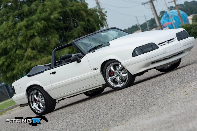 I pulled up to a junkyard and this car was about to be crushed. -Chris SmithChris Smith from High Point, North Carolina, is the proud owner of this insane 1992 Fox-body Mustang convertible with quite the extensive mod list. Just by looking at the exterior, it just looks like a super clean white Fox-body ‘vert with perfect contrasting black trim and convertible top, but just pop the hood and you will see just how much has been put into this ride. This car has been in Chris’s possession for the last eight years where it has come a long way since he first came across it by accident.