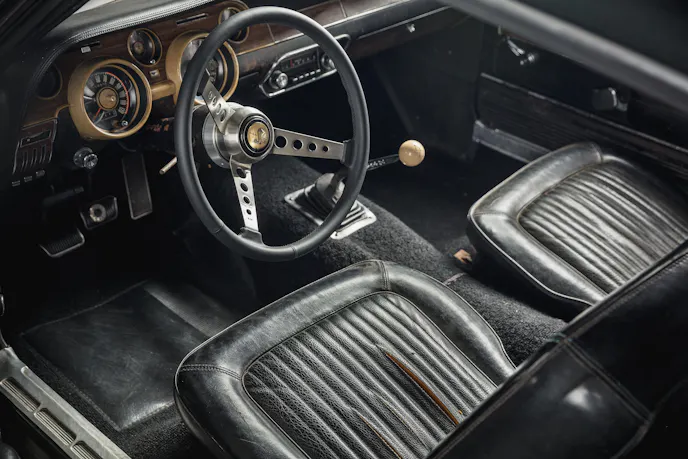 Rather than outfitting the Mustang with garish doodads to give it a head-turning look, the Bullitt car was essentially de-contented from its original spec – the pony emblem in the grille was removed, as was the badging and other OE-equipped embellishments, and a set of five-spoke American Racing Torq Thrust wheels replaced the factory rollers.