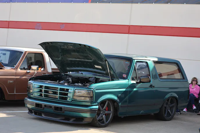 Looking sleek in gray paint and slammed on a lowered suspension, this built Bronco takes those ’90s vibes to a new level. There is more than just slammed style to this classic SUV, however. Under the hood, it sports a Coyote swap breathing in ProCharger P-1SC boost through a Boss 302 intake. This potent people hauler shows the potential of Broncos from that era.