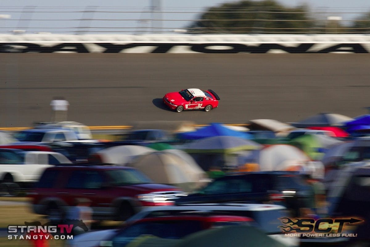 Crew and drivers gather at the garages to debrief from Friday's testing and prepare for the following day. Here the BTE Sport #17 Mustang cools off in the fleeting sunlight.