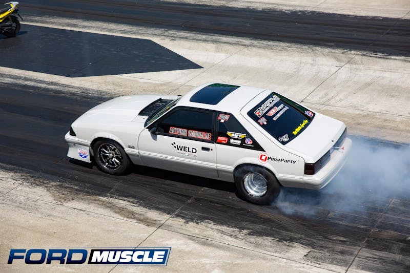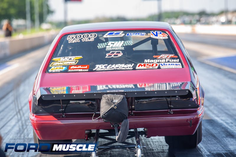 In a field of thirteen cars, Coyote Stock was lead by Nathan Stymiest in a ’92 Fox-body, running 9.90 at 134mph. Kevin McMullin in the SN95 trailed at 9.978 with Shane Stymiest right on his heals with a 9.79 in an ’89 Fox. The sealed crate engine class featured four cars running sub-10s in qualifying, and a fifth car (Randy Soper) going 10.001 at 135mph. A testament to how close this field is, the slowest car still runs a 10.13 at 131mph. Despite there being faster heads-up classes, Coyote Stock is easily one of the most fun to watch as evidence by Mark Anderson’s wheelie.