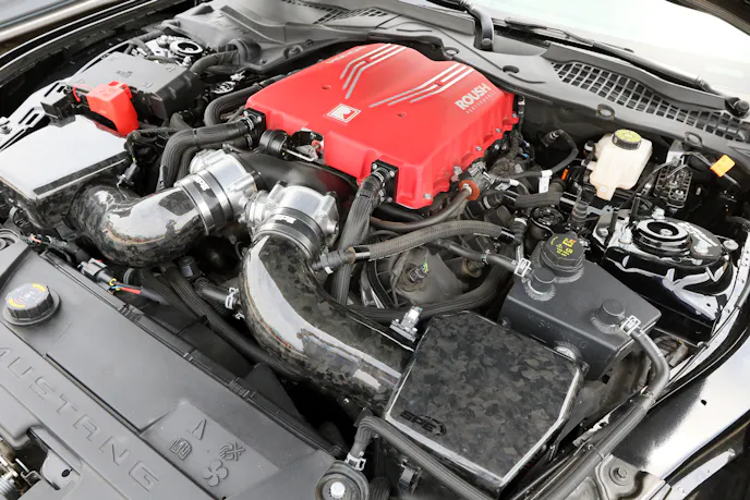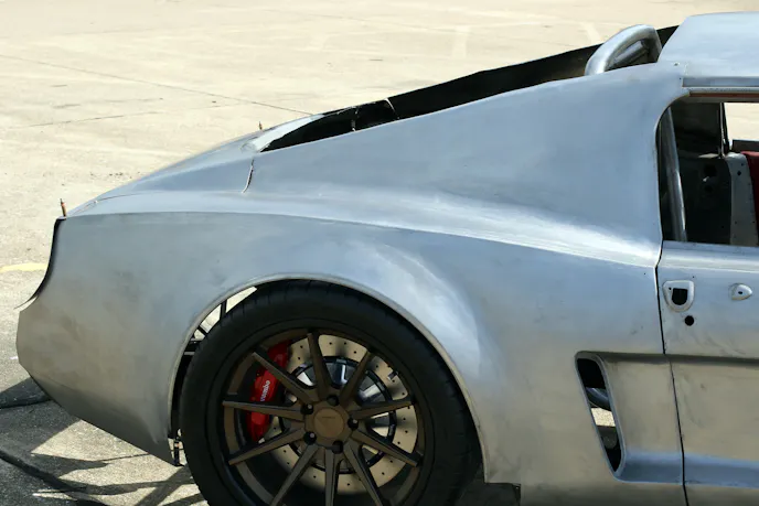 If you are into more wild and custom Mustangs, there was no shortage of those as well. Detrick and Becky Thomas put together an impressive 2015 Mustang build, that is definitely one of one. A mix of Anderson Composites and TruFiber carbon exterior parts complete the panda look with the factory white paint. Work CR2P two-piece, 20-inch wheels and an Airlift system give the aired-out stance, but its signature sound is complements of a Paxton supercharger kit with BBK headers and a Gibson exhaust. Not one thing on this S550 has been left untouched. Dakota Simon’s 2024 Performance Pack GT also caught my attention but for its subtlety. The rear wheels look stock, but with beadlocks and drag radials. Upon closer inspection, the turbo kit was home-built but done beautifully with titanium charge pipes. It doesn’t hurt that it makes 1,045 horsepower at the wheels. Troy Kelly’s ‘68 “GT350 Tribute” uses a reproduction body for something truly unique – a built Voodoo engine with a ProCharger D-1X, Tremec 6-speed, Independent Front Suspension and 4-link rear. Troy built and painted the car himself.