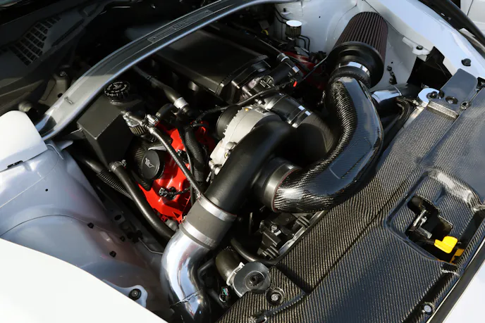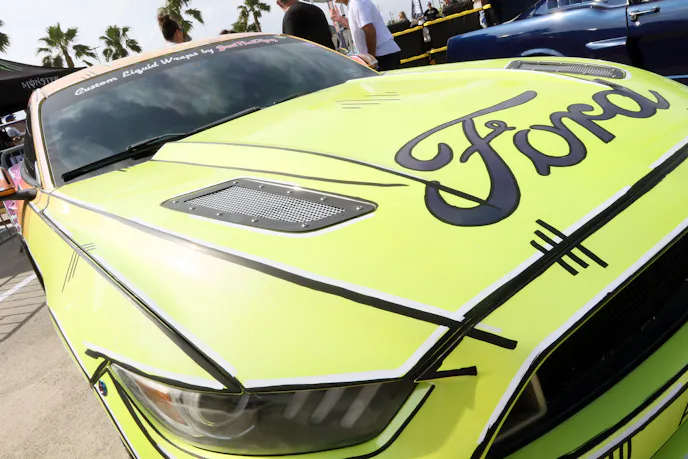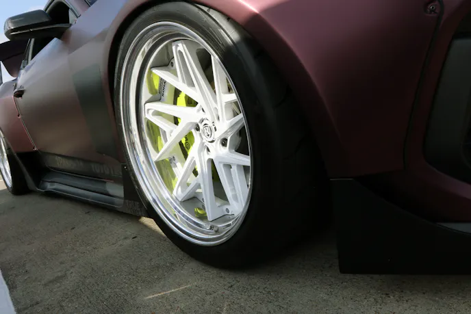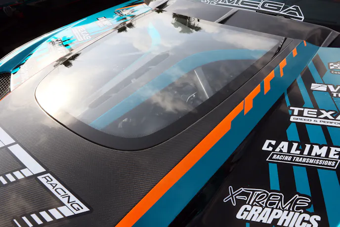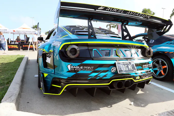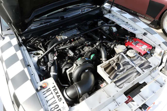 A pair of racy S550s from the 777 Drift Team also stopped many in their tracks. These wild-looking wide-bodies are fully street legal, so the team actually drove them into the party and parked them. They sound rowdy but the Coyote platform is so tame, even with 1,300-rear-wheel-horsepower. A Texas Speed Brawler long-block with a VMP Odin supercharger peak through the custom hood. Chris Hill and Jamey Meyer pilot the S550s, which have matching wraps with slightly different color schemes that are as wild as the body work.
