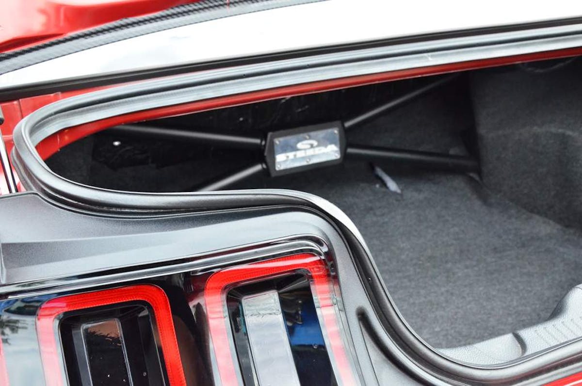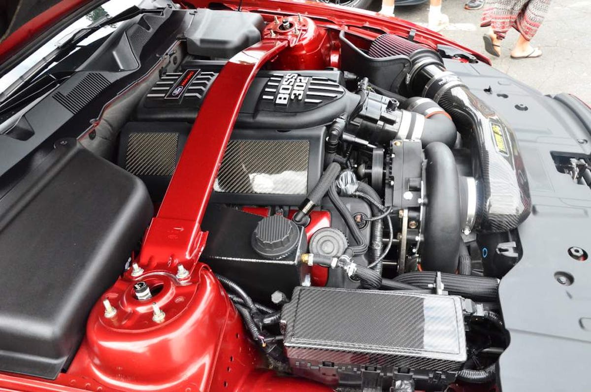 Tucked up in the fenders are a set of Velgen Wheels finished in a gunmetal gray that goes great with this particular shade of red. Under the hood, the Coyote 5.0-liter engine wears a Boss intake manifold and a Paxton supercharger. You can check out more of this beauty on Instagram by following the owner here.