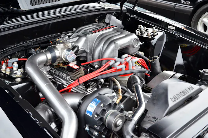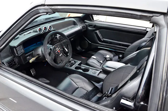 At first glance, Josh Miller’s bright red GT looks like a 1993 Cobra, but it’s actually a cleanly executed 1992 Coyote-swapped build. The modern 5.0-liter is topped with a color-matched Boss 302 intake that ties it to the exterior perfectly. Inside, a set of Sparco race seats and an all-black interior give it a focused, driver-oriented vibe that fits the car’s aggressive personality.