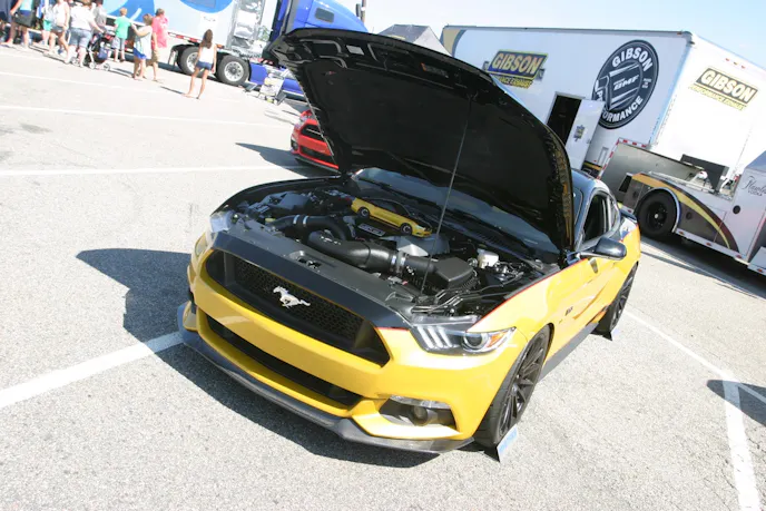 Mustang Week vendors also have their spots packed with merchandise, Mustangs, and attention-grabbing swag for attendees to check out, and try out. Gibson Performance Exhaust has its Gibson S550 at the speedway for everyone to see, and hear the company’s new exhaust system for 2015 Mustangs. The Mustangs in its booth are showing off Gibson’s headers, X-pipe, mufflers, and tailpipes.