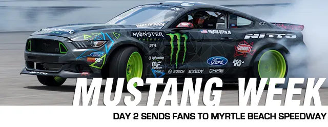 Today we’re out at Myrtle Beach Speedway for the autocross, fun runs, Vaughn Gittin Jr exhibition, burnout contest, and thrill show. It’s a warm one so we’re all staying hydrated on Mountain Dew and Monster, and taking in the on-track action as Mustangs make their way around the track.
