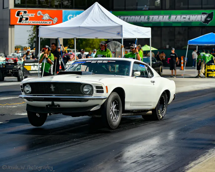 Jason Neshiem and Chad Poncelet brought a 1970 Mustang Mustang to run in the Pro Street Power Adder category. The Mustang sports all its original glass and steel panels, and is powered by a 427 cubic-inch Windsor with a Dart block, Brodix heads, custom ported 2924 intake, and twin-blade 1200 cfm carb with a nitrous oxide fogger system. The car has a 4-link out back with a 4.11 gear to help propel this fine steed to a 8.65560 at 154.94mph average over 5 days with a best pass of 8.607 at 154.91 on Wednesday (day 3) at US131 Motorsports Park in Martin, Michigan.