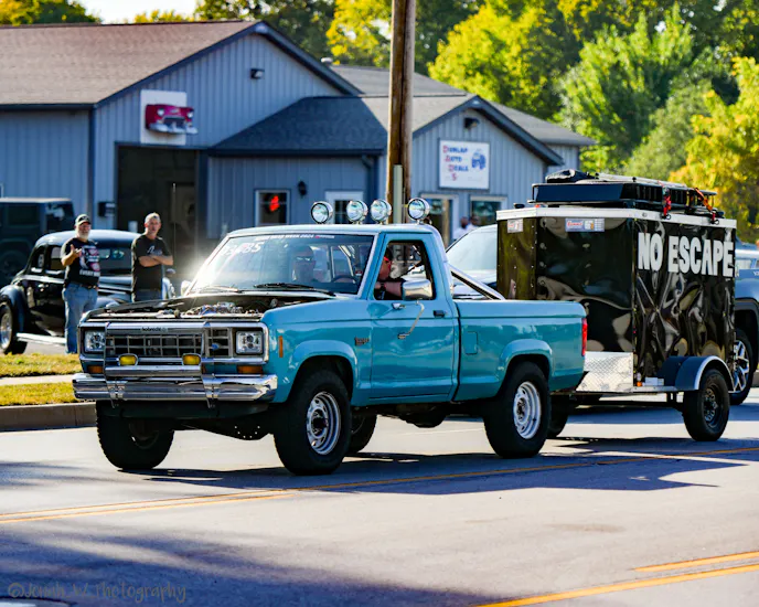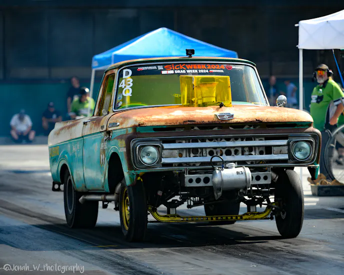The first one would be Mike Wiles and Roger Heston, in a 1961 Ford F100 running in the B Gas category that is aptly named “The Cluster Truck.” This truck, with its teal and white two-tone and patina, caught my eye on day 1 pulling into the checkpoint at Hawkins Speed Shop in Richmond, Indiana. The ’61 F100 gasser is powered by a 347 stroker with a Schneider cam, tunnel ram with 450 Holley carbs, back by a Ford AOD Transmission and a Winter’s Quick Change rearend from a sprint car. They use a 5.13 gear set for the strip and swap to 4.11s for the street. It had a week-long average of 13.69380 at 90.58 with a best pass of a 13.160 at 89.93mph at National Trail Raceway on Monday (day 1). They started battling transmission issues through the week, slowly losing gears and on day 3 they lost Overdrive. On day 4 they would lose Reverse and Neutral while trying to push the truck, which would inadvertently weld the clutches together and by day 5 they would lose Second gear. They would still manage to limp the truck through the day and drive it home – a great example of the fighting spirit of Drag Week!