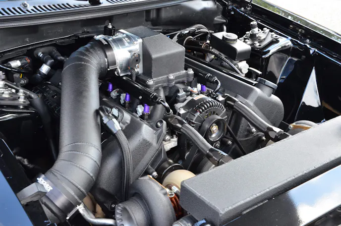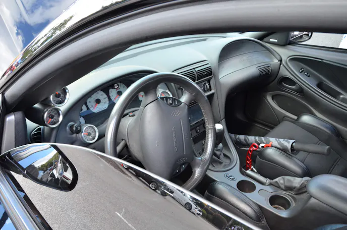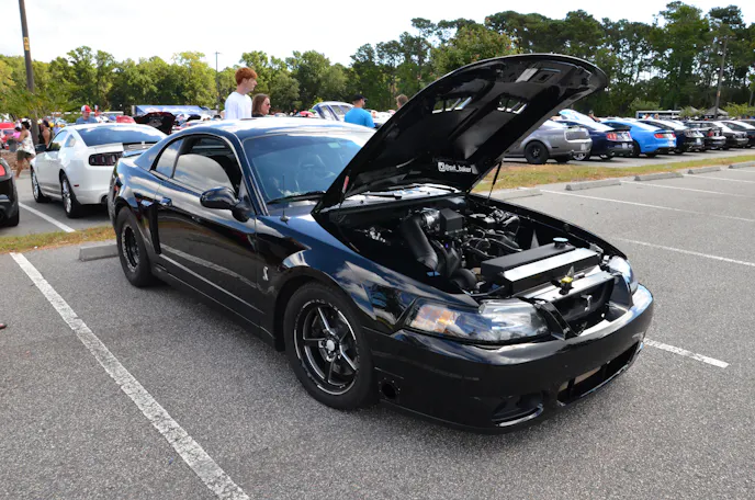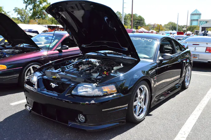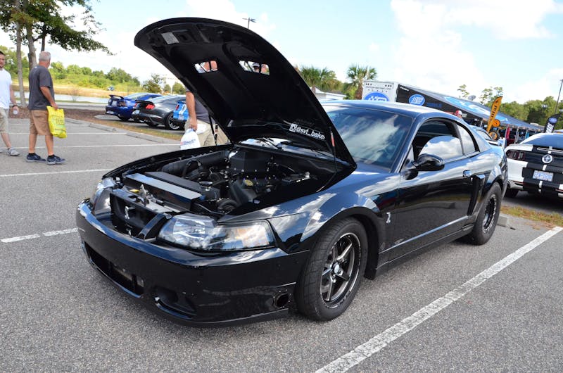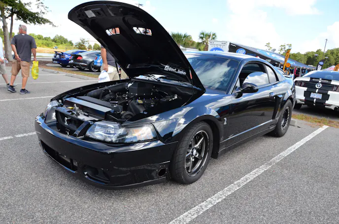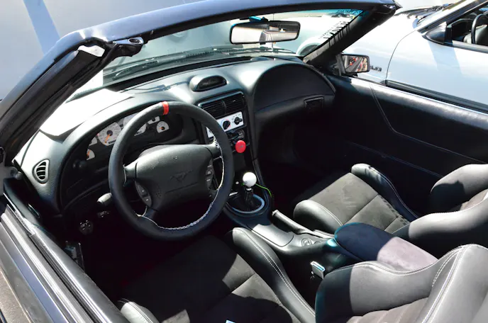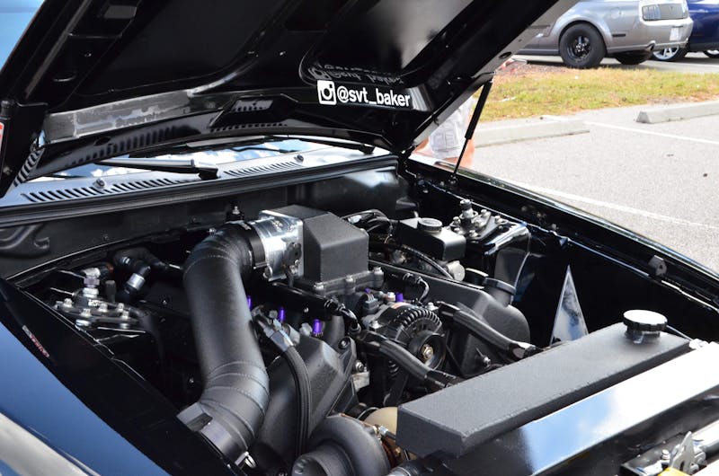While it is right at home sitting in the Mustang Week show field, this car is definitely more about the go end of the spectrum. Attached to the stock Cobra bottom end is a set of twin 64 millimeter Precision Turbos along with as set of custom cams among other goodies. A built T56 and Ford 9-inch rearend back up this DOHC 4.6-liter monster. Taylor estimates the car puts down somewhere around 1,100 rear wheel horsepower, but was not as quick to divulge an actual quarter-mile time. However, we would feel pretty safe betting this black beauty has to be capable of something in the low nines or maybe quicker. We guess you will just have to find him at a track near you and find out for yourself.