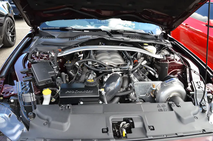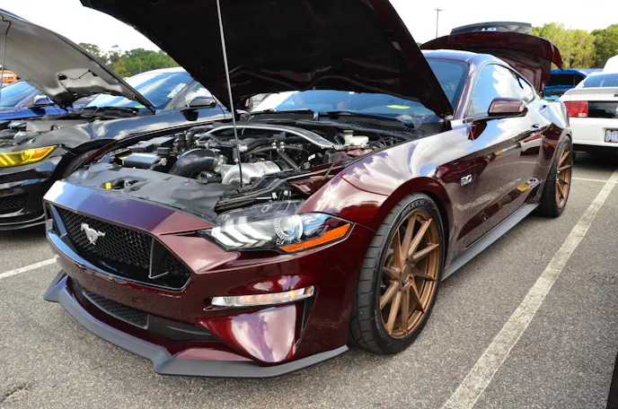 Danny Taylor has owned his share of wicked Mustangs before, including several wicked Terminator Cobras, but his latest creation, this ProCharged Crimson Metallic 2018 Mustang GT may take the prize as the coolest one yet. An already beautiful car from the factory, it wears a set of gold Avant Garde wheels, which supplanted the factory Performance Pack wheels, which really contrast nicely with the paint. Under the hood, the already potent Gen 3 Coyote wears a ProCharger D-1X tuned by Rick Erdman at Amazon Tuning Solutions. The car was finished just in time for Mustang Week and, as of this writing, is running a safe tune. Once the power is turned up, however, Danny tells us he expects the car to make somewhere close to 700 horsepower at the tires.