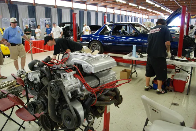 One of the most-talked about events going on all weekend is the Fox-body Mustang/Coyote 5.0 engine swap that Kurgan Motorsports is performing live, in front of everyone. Contestants submitted estimates of how many hours and minutes it would take Kurgan to perform the whole swap, and the winner gets $1,500 in Ford Racing performance Parts.