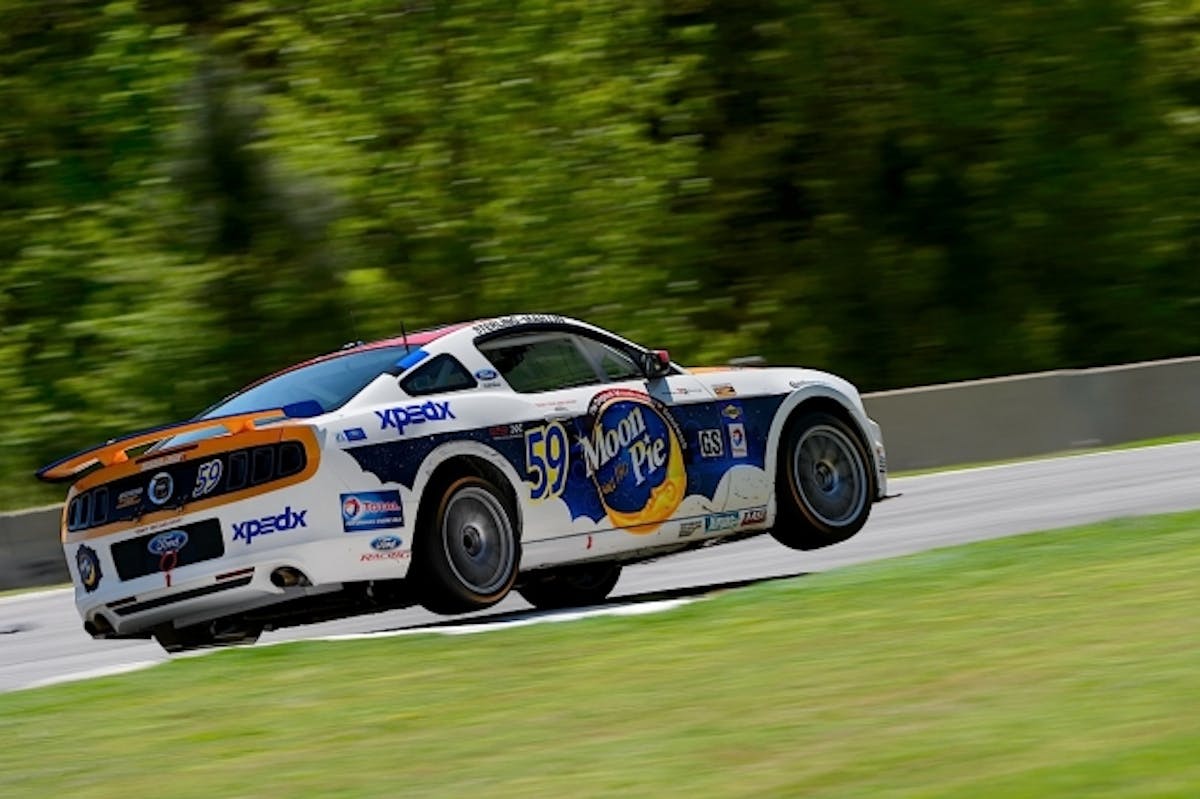 Dean Martin in the MoonPie Mustang hops the turn three curbing on its way to a 13th place finish in the PwC 250 at Road Atlanta.