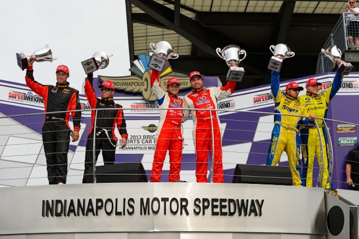 To the winners go the spoils! Brian Sellers and Mark Boden celebrated their victory at Indy, Billy Johnson and Jack Roush Jr. savored second, and Bill Auberlen and Paul Dalla Lana took third.