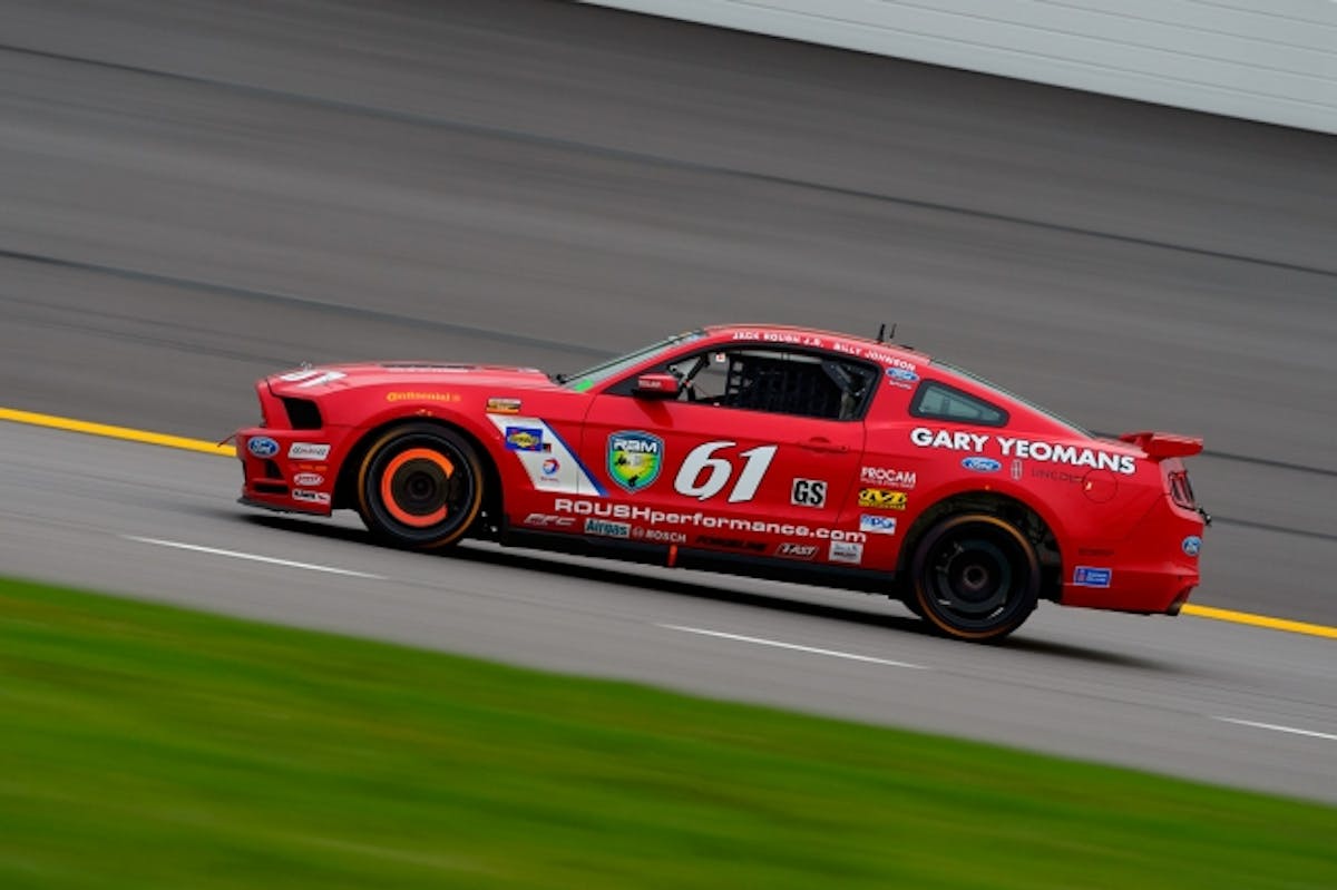 Billy Johnson drives his severely battered #61 ROUSH Performance Mustang BOSS 302R to a solid 11th place finish after co-driver Roush qualified 5th at Road America.