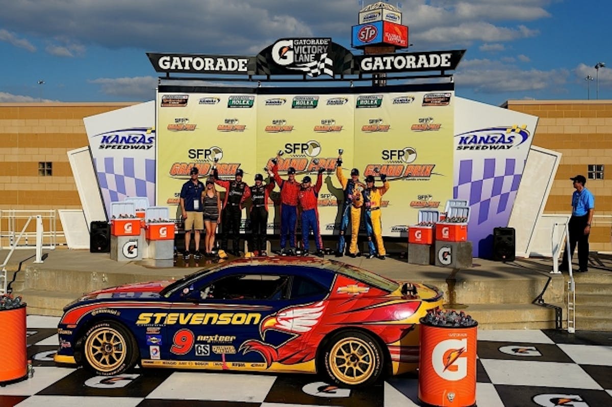 John Edwards and Matt Bell stand atop the podium after driving their #9 Stevenson Motorsports Camaro to victory at Kansas Speedway. They are joined by Matt Plumb and Nick Longhi (#13 Rum Bum Racing Porsche), who finished second, and third-place finishers Joey Atterbury and Shelby Blackstock(#51 ROUSH Performance Mustang BOSS 302R).