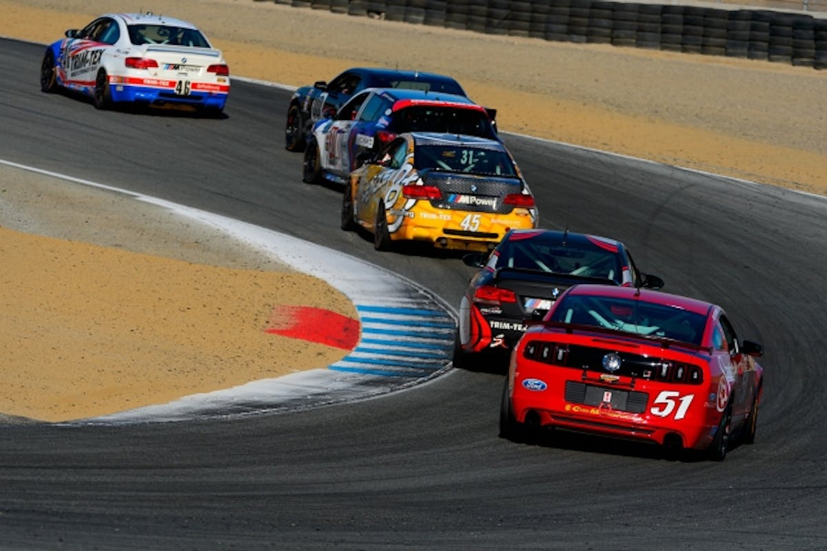 The #51 ROUSH Performance Mustang BOSS 302R is the caboose in a freight train through turn nine at Laguna Seca. Shelby Blackstock qualified the car third, and Joey Atterbury finished the race 9th after contact between it and the #48 BMW and #55 Aston Martin on the last lap.