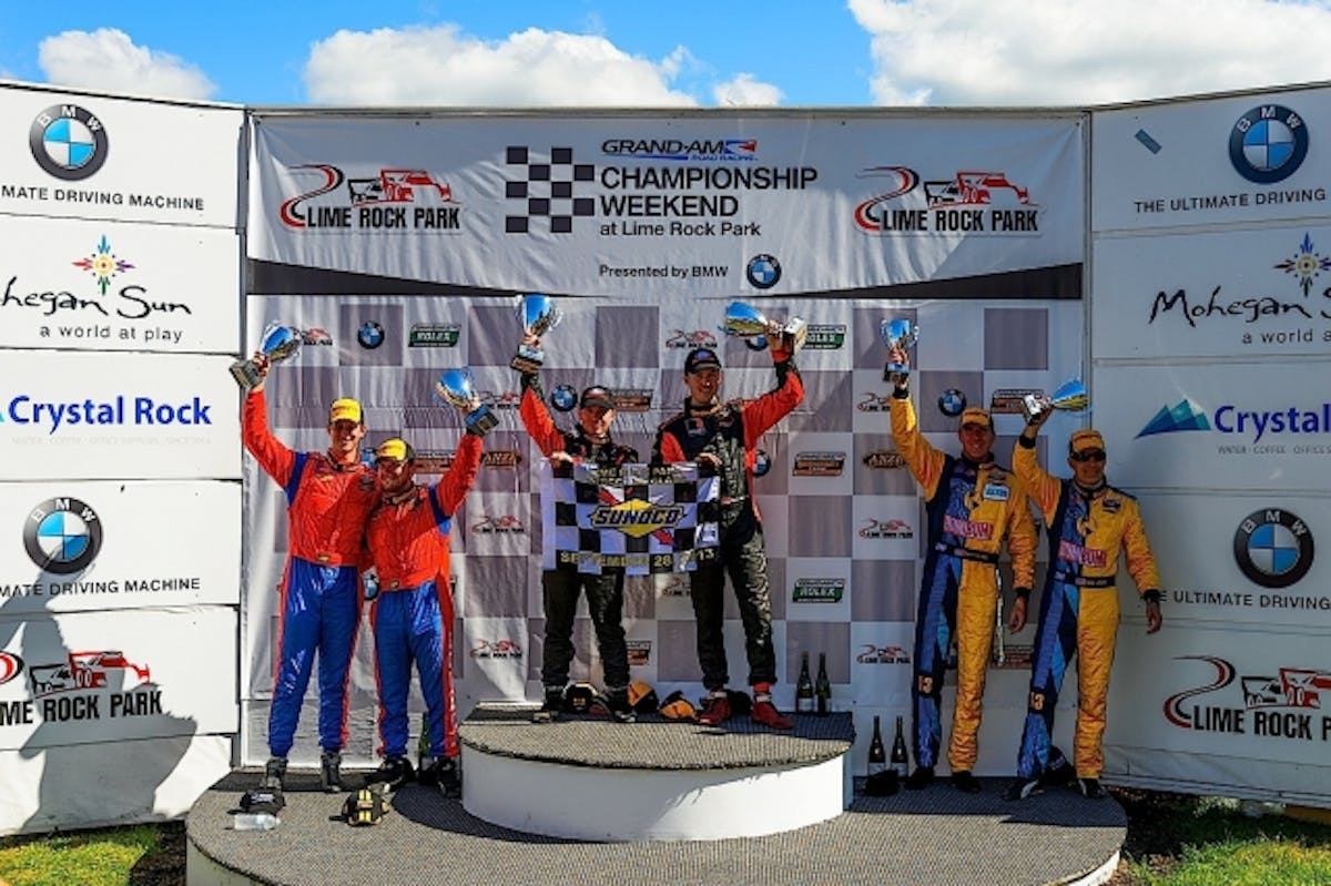 Victors Jack Roush Jr. and Billy Johnson stand atop the podium at Lime Rock Park. It was the second victory of 2013 for the drivers of the #61 ROUSH Performance Mustang BOSS 302R. John Edwards and Matt Bell drove their #9 Stevenson Motorsports Camaro to second in the series finale and also the series championship. Rum Bum Racing drivers Matt Plumb and Nick Longhi took third as well as the season title at Lime Rock.