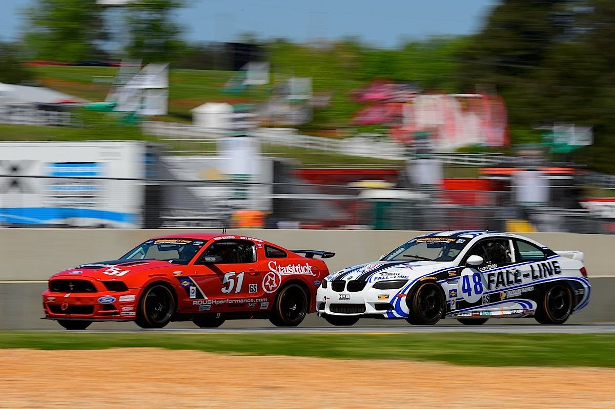 Shelby Blackstock (#51 Mustang) holds his inside line while Charlie Putman (#48 BMW) attempts a pass on the outside into turn one during the opening laps of the PwC 250 at Road Atlanta.