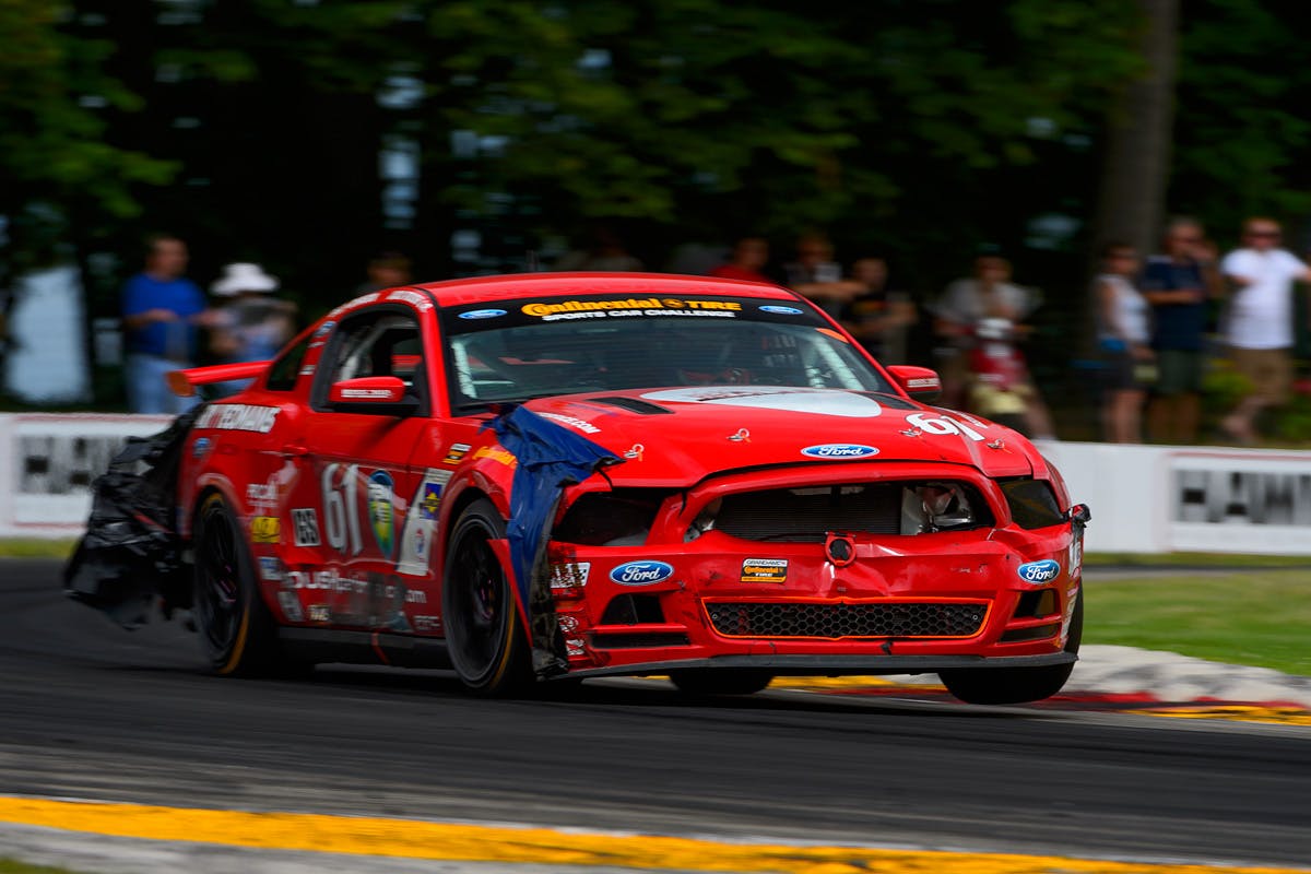 Billy Johnson drives his severely battered #61 ROUSH Performance Mustang BOSS 302R to a solid 11th place finish after co-driver Roush qualified 5th at Road America.