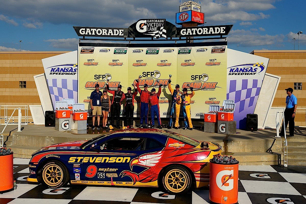 John Edwards and Matt Bell stand atop the podium after driving their #9 Stevenson Motorsports Camaro to victory at Kansas Speedway. They are joined by Matt Plumb and Nick Longhi (#13 Rum Bum Racing Porsche), who finished second, and third-place finishers Joey Atterbury and Shelby Blackstock(#51 ROUSH Performance Mustang BOSS 302R).