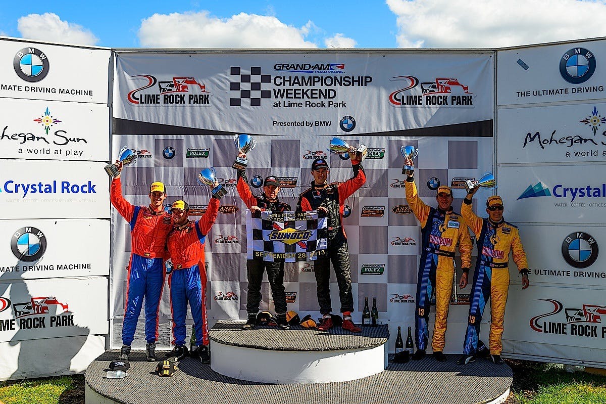 Victors Jack Roush Jr. and Billy Johnson stand atop the podium at Lime Rock Park. It was the second victory of 2013 for the drivers of the #61 ROUSH Performance Mustang BOSS 302R. John Edwards and Matt Bell drove their #9 Stevenson Motorsports Camaro to second in the series finale and also the series championship. Rum Bum Racing drivers Matt Plumb and Nick Longhi took third as well as the season title at Lime Rock.
