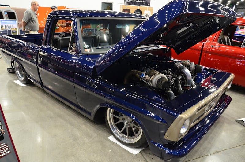 This cool truck that did not quite make our Top 10 but it did features a cool and unique engine. We highlighted several Coyote-swapped trucks earlier, but this was the only V10-swapped truck we spotted along the way. The twin 55mm turbos and a big engine make John Lamb's 1961 Unibody one fun little pickup!