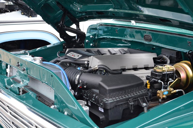 It was the old-school Centerline wheels that first drew our attention to the truck. The wide centerlines out back, with some Hoosiers mounted on them, give that fat rear fender the perfect, timeless look. Under the hood, vintage Cobra valve covers and a dual-carb setup top the Ford powerplant, which is nicely finished off with a modern serpentine belt arrangement. The huge Wilwood power booster on the firewall gives us a hint of modern braking capabilities, while the big MSD 6AL box on the firewall gives off those retro vibes. That theme held inside the truck, as the ratchet-style B&M shifter cleanly blended in with the leather, modern console, and other upgrades.