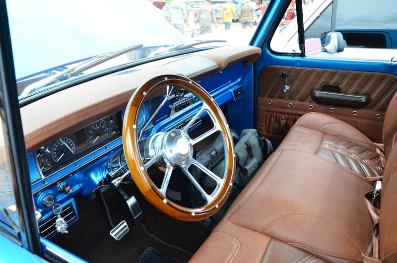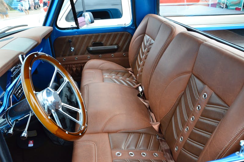 It was the old-school Centerline wheels that first drew our attention to the truck. The wide centerlines out back, with some Hoosiers mounted on them, give that fat rear fender the perfect, timeless look. Under the hood, vintage Cobra valve covers and a dual-carb setup top the Ford powerplant, which is nicely finished off with a modern serpentine belt arrangement. The huge Wilwood power booster on the firewall gives us a hint of modern braking capabilities, while the big MSD 6AL box on the firewall gives off those retro vibes. That theme held inside the truck, as the ratchet-style B&M shifter cleanly blended in with the leather, modern console, and other upgrades.