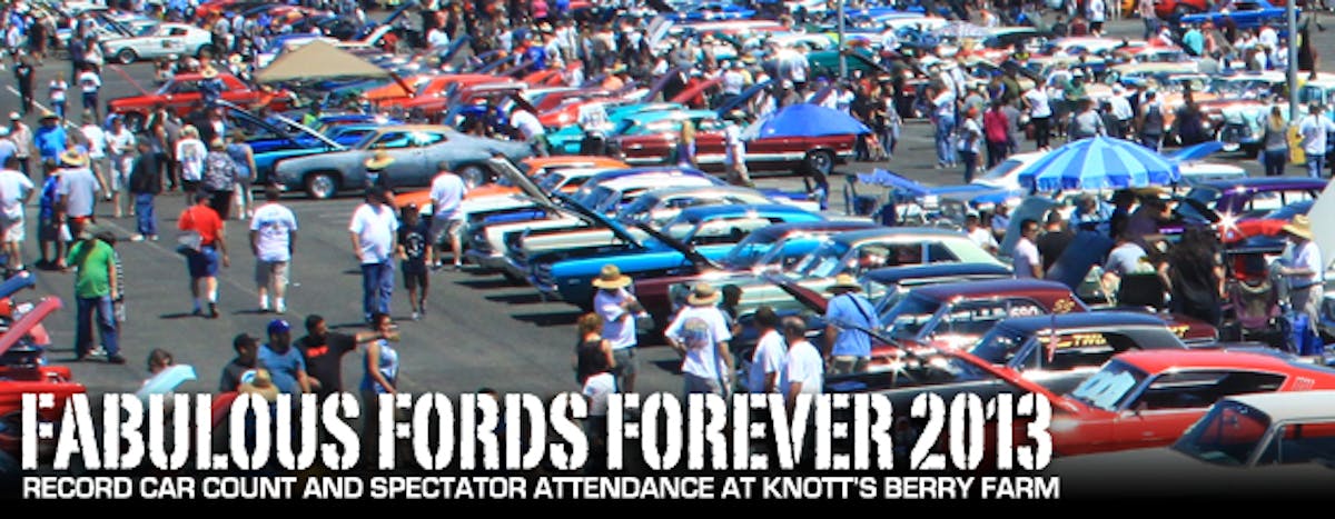 Ford Motor Company celebrates 110 years of automotive excellence in 2013 and what an exciting year it has been so far. If you live in the far western USA and you love Fords, the annual Knott’s Berry Farm Fabulous Fords Forever is a one day celebration of genuine Ford blue blood that you should definitely check out. This event is the show season’s opening kickoff every year in Southern California. Everyone who is anyone with a passion for Ford power comes to Knott’s in April. If you attended Fabulous Fords Forever this year, you know it was the largest turnout in the event’s history. There was a special kind of energy in the air this year with a line-up of Fords, Lincolns, and Mercury’s from throughout Ford history. The air was rich with the sounds, sights, and smells of Fords from more than a century of corporate history. The soft chatter of mechanical tappets in vintage Y-blocks, FE-Series big-blocks, BOSS Mustangs, and Hi-Po GTs echoed off buildings drawing the attention of thousands. Fabulous Fords Forever is the largest one day Ford show in the nation.
