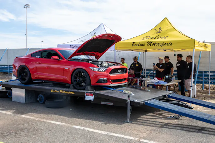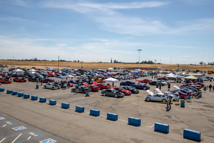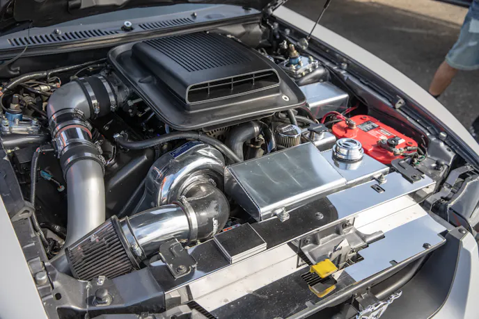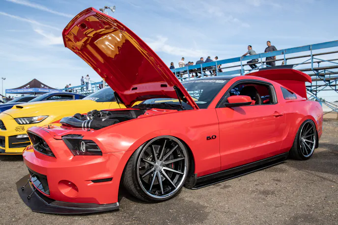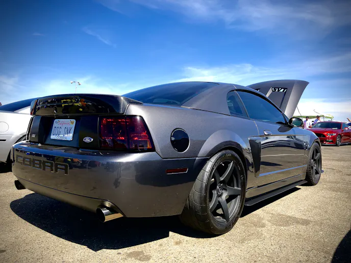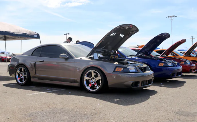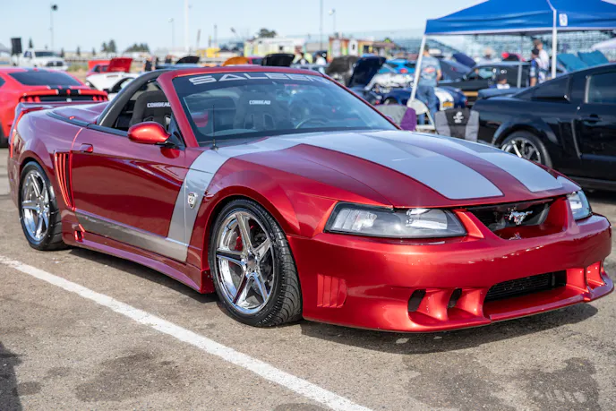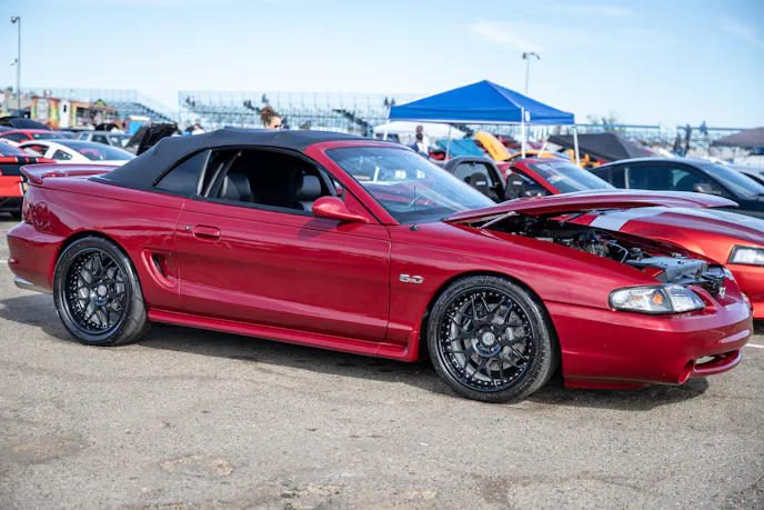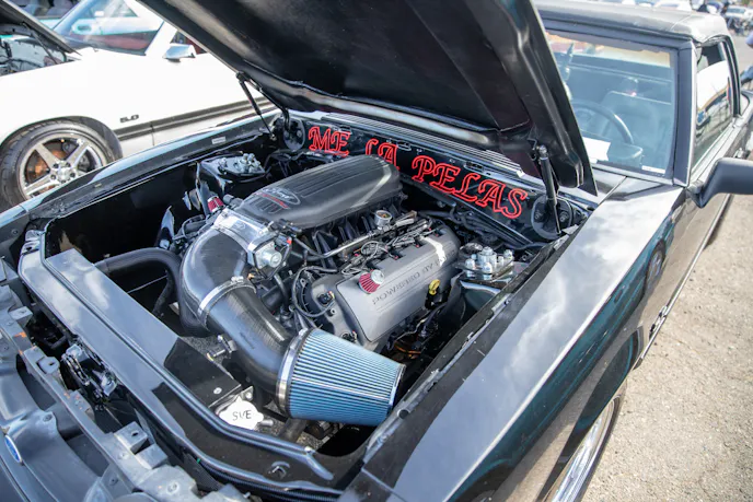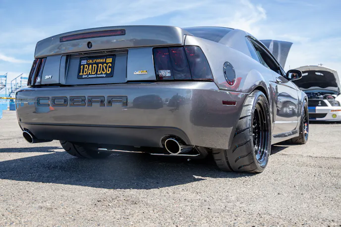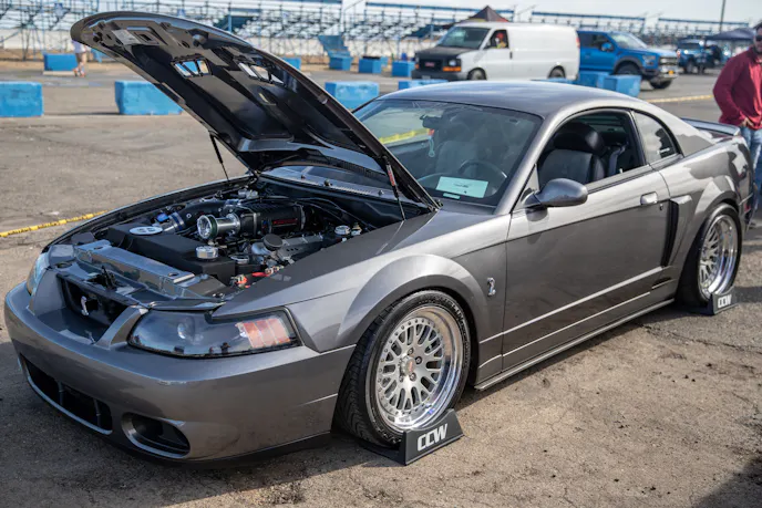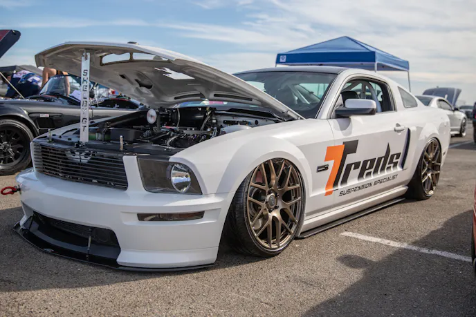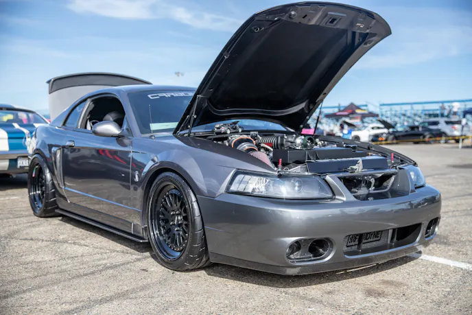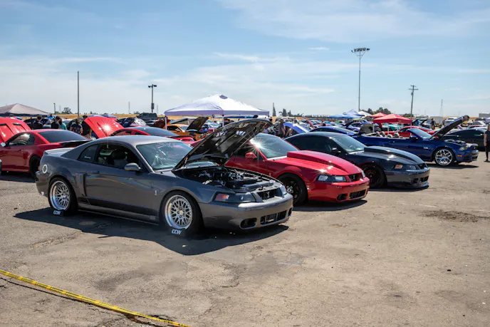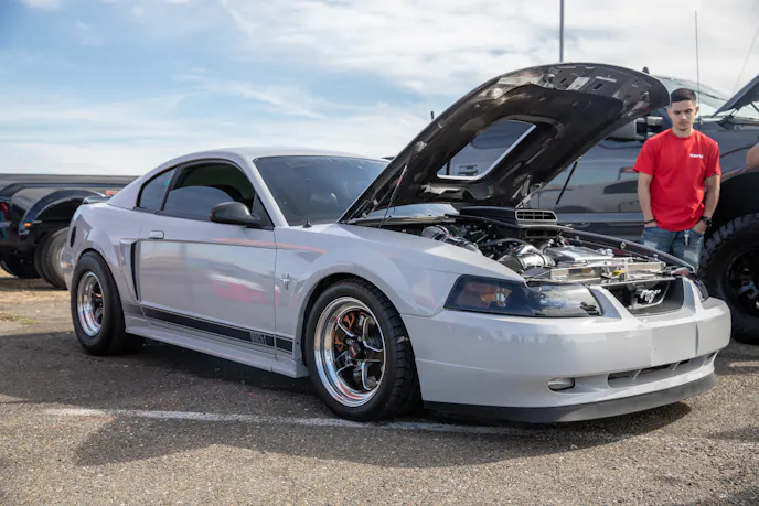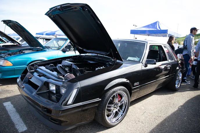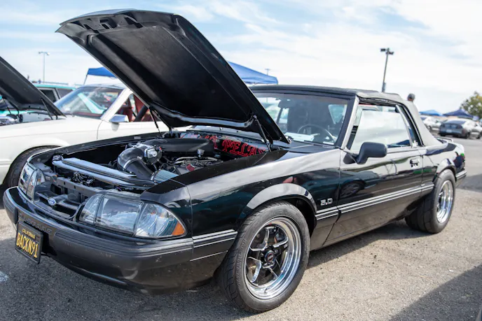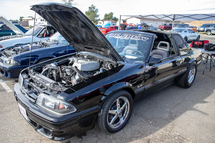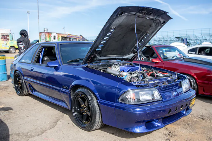 This 1991 Fox-body convertible owned by Ever Millan is a sleeper thanks to a Gen 1 Coyote hiding under the hood. It’s been fortified with a Ford Performance Cobra Jet intake manifold, a Dmark CAI, Ford Performance Twin 65mm throttle body, 4.10 gears, a 6r80 transmission from an F-150, and an AED E85 tune good for 440 horsepower and 428 lb-ft at the wheels. The newly added burnout pit brought plenty of average joes and even some unofficial pros, like Yoni Padilla who tossed his 2006 Mustang GT convertible around like he meant it. The Three-Valve had an AirLift air-ride kit, 20-inch FR500 wheels, carbon hood, and Borla exhaust system.Get used to the view, because should you choose to line up with this Cobra, all you’re going to see is its taillights! Manuel Cervantes’ Terminator Cobra is making four-digit horsepower thanks to a built motor with a Teksid block that’s been filled with Diamond, MMR, and ARP goodies, and then topped with a 3.4L Whipple Crusher supercharger and an E85 fuel system.Final Stage Mobile Detailing was out in full force, ensuring no dirty cars were to be found, as they offered up their knowledge and professional detailing services to showgoers.