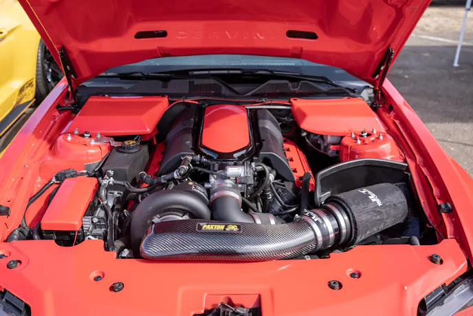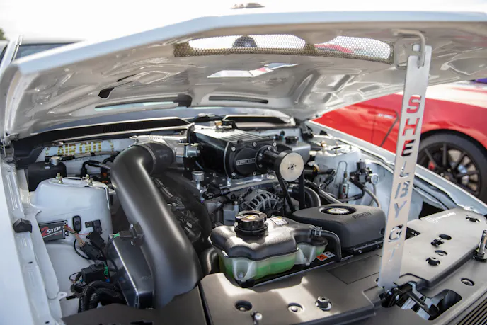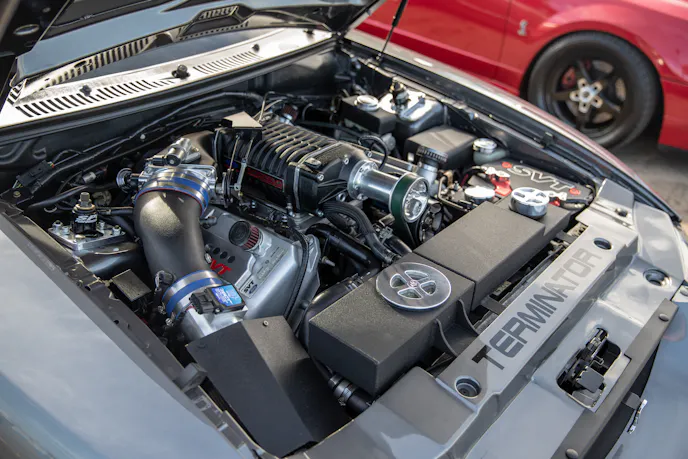 Harm Singh Virk’s 2014 Mustang GT is clean and mean thanks to a Paxton 2200 blower kit with a Paramount tune, ID1050X Injectors, a full Fore Innovations fuel system, Pypes offroad H-pipe, Corsa cat-back that adds up to 690 horsepower at the wheels. On the show side, it has an AirLift V2 air-ride suspension system, Ferrada wheels, a GT500 frontend, plenty of TruFiber bits, custom headlights, and BMR lower control arms and relocation brackets to help plant the power. Yes it’s a real Saleen Cobra convertible . . . yes, they made but a handful of Four-Valve Saleens, and one was actually there on display thanks to the owners, brothers Alonso and German Chavez.Yup, another jaw-dropping Terminator Cobra, and it’s DSG! Don’t be fooled, as no two were alike. Christian Diaz’ 2003 featured a built engine with a Teksid aluminum block, ARP hardware throughout, a 2.9L Whipple Crusher supercharger, a Fore Innovations E85 fuel system with ID1000 injectors, Kooks long-tubes and X-pipe, Borla Stingers, UPR suspension, CCW wheels and a Kurgan tune good for 800 horsepower and 709 lb-ft at the wheels.
