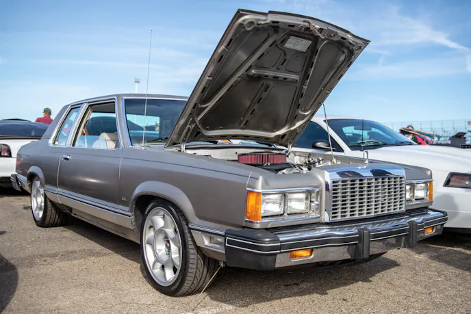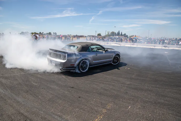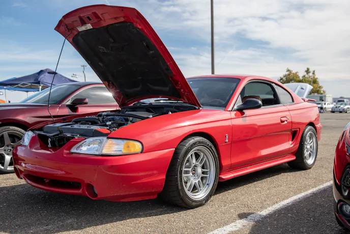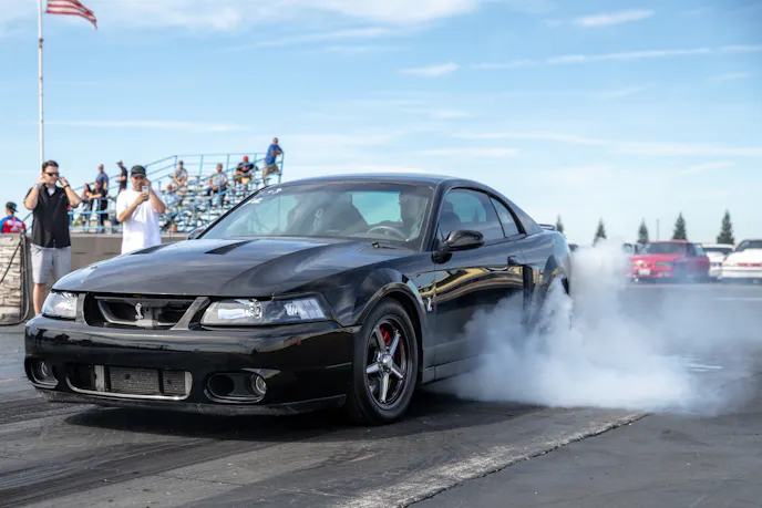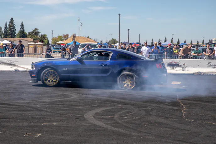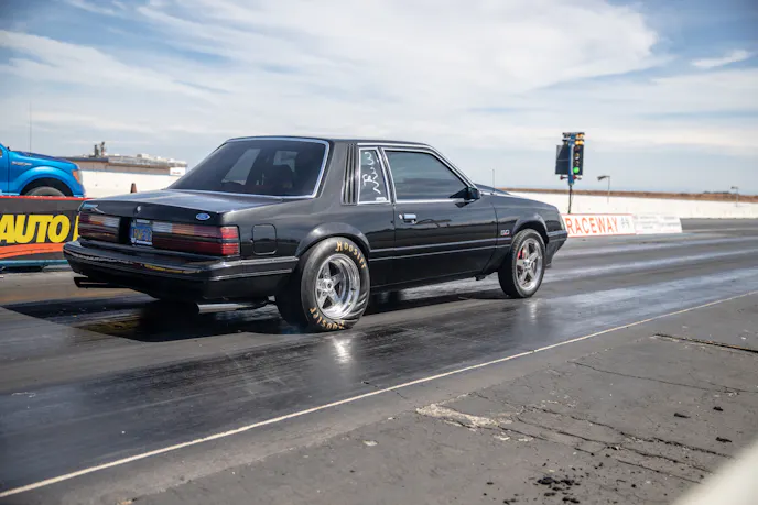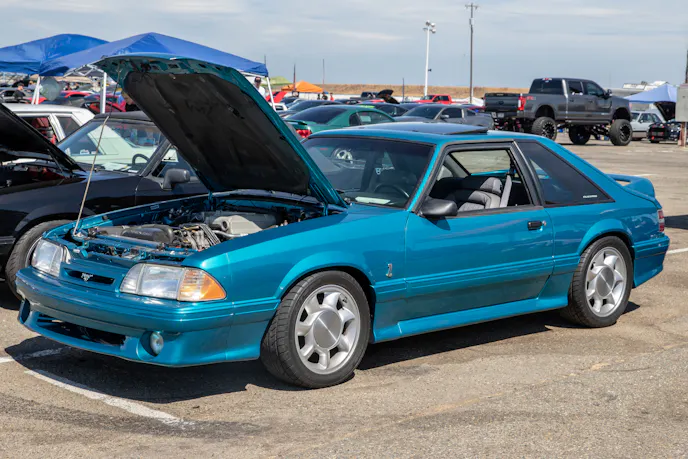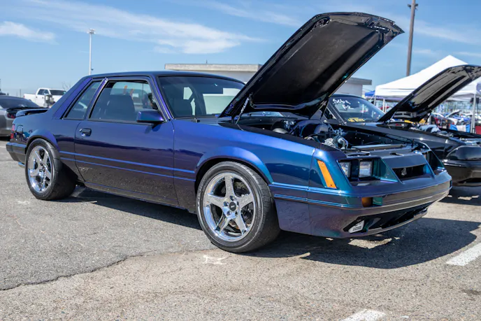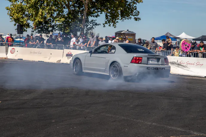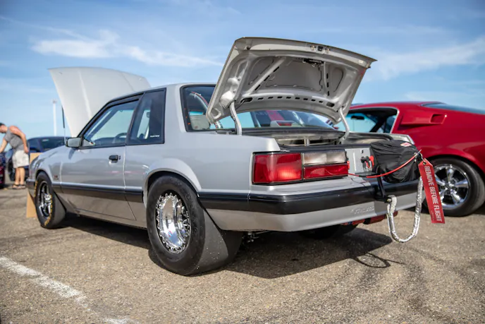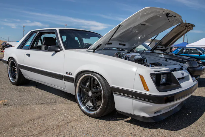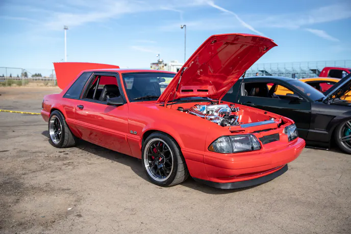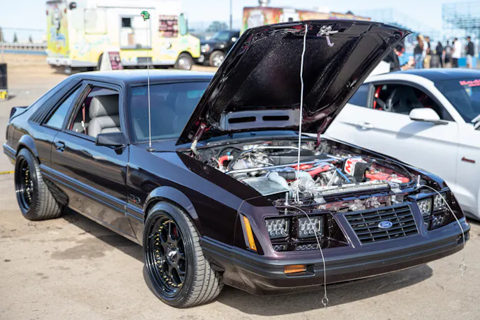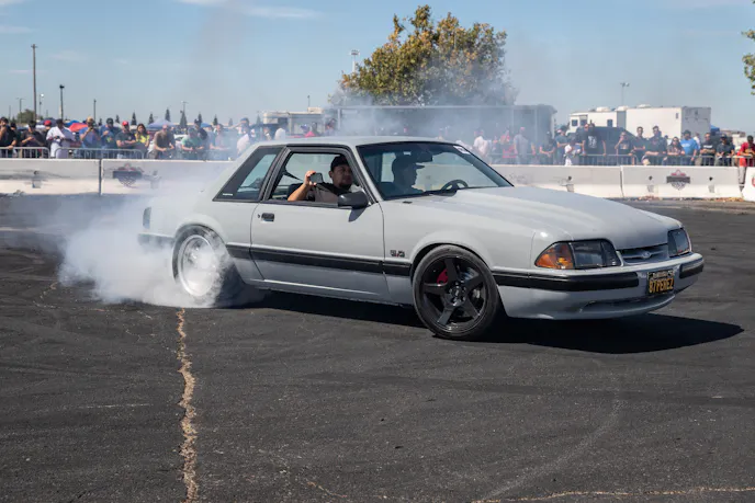 John Giasi’s wicked 1991 Coupe was another killer build from the AED camp that was turning heads thanks to plenty of show and go. This mid-8-second Fox-body makes 1200 horsepower at the wheels thanks to a huge ProCharger blower and a FAST XFI standalone computer orchestrating and charging a small-block Ford that’s backed by a C4 transmission. Spencer Cookson, William Pugach, and Jack Lyster might be smiling now, but every time they lined up at the tree, it was every man for themselves. Honestly, what’s better than a day of friendly rivalry at a car event?Ivan Garcia’s survivor 1993 Teal Mustang Cobra features Maximum Motorsports suspension components and is otherwise stock. When’s the last time you saw a clean Fox-body Cobra?Dominique Burton threw his 2000 Mustang GT Cobra clone around like he was a pro drifter thanks to a Cobra IRS, complete suspension, and brake swap. The Pypes longtubes, X-pipe and straight pipes, Bama tune, BBK fuel rails and cold-air intake and MSD two-step only made the smoke show that much better.Sacramento Raceway proved the perfect backdrop for the event, as the fall weather brought plenty of sun and mild temps; the track was also biting and the crowd came out in droves to see the fast cars put it down.We’re a sucker for clean SN95s, and these days they’re getting harder to find. How’s this for a clean ’vert?The Fox-body excels at many things, and doing donuts is one of them, as John Sebastian Perez’s 1987 Mustang LX coupe demonstrated for the camera. The notchback features a 306 with full bolt-ons, Cobra brakes, Eibach springs, and a Nardo Gray paint job from Oak Valley Autobody in Oakdale.Tayron Young, the founder of Capital City Mustang Club, can be seen individually calling the winners up to accept their awards.We even saw a few LTDs, Crown Vics, and Fairmonts at the show — how’s that for cool?Look closely inside the headlight. Not only does it feature color-changing LEDs, but there’s a howling Coyote in the center of the projector as well — sweet!Michael and Vanessa Bengston took full advantage of the row of food trucks serving up gourmet bites and sweet treats. Nothing better than horsepower and hamburgers!