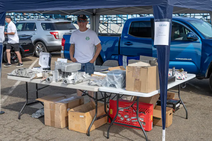 Modded Terminator Cobras, though rare in the wild, were in strong order at the show. Shimraaz Ali brought his, with a Gen 2 2.3L Whipple blower, Accufab monoblade throttle body, JLT RAI, SCT MAF, and ARP head studs and cam bolts. The endlessly long modification list includes: ported intake valves, Bullet Racing cams by Bob Kurgan, Manley forged pistons, Mac headers, Lethal Performance off-road x-pipe, Borla Stingers, Edelbrock waterpump, Moroso reservoirs, N2MB WOT Box, Billetflow idlers, dual Walbro 465s, ID1050X injectors, Division X and Aeromotive fuel components, MGW short shifter, McLeod RXT clutch, Stifflers driveshaft safety loop, 18-inch CCW wheels, H&R springs, Maximum Motorsports caster camber plates, UPR bumpsteer kit and Wilwood 6-piston calipers and 14-inch rotors. Did we mention it makes 728 horsepower and 685 lb-ft at the wheels on E85 with an AED tune? Alex Palominos showed his Coyote pride with this cool shirt, but it’s not all bark and no bite, as he also owns an S550 with full bolt-ons, Roush aesthetic mods, and GT350R replica wheels.That’s a wrap! No really, Hilario Serrano’s 2014 Shelby GT500 is wrapped with 3M Fiery Orange vinyl to look the part, but it also plays it with 800 horsepower and 820 lb-ft at the wheels, with a best pass of 10.01 at the strip. All of this comes to you from Kooks long-tubes and a catted x-pipe, Corsa Sport exhaust, a JLT CAI, VMP TwinJet 67mm throttle body and 2.5-inch upper pulley with idler, ID1000 injectors, JMS PowerMAX pump voltage booster, a Fore Innovations fuel system, an AED E85 tune, Weld RTS wheels, BMR drag springs and panhard bar, UPR rear control arms and Viking shocks.Earlybirds busted down the doors long before the sun was up to get at the swap meet that featured plenty of parts for every project, including classic FoMoCo bits and plenty of Fox-body and newer hard-to-find parts, too.