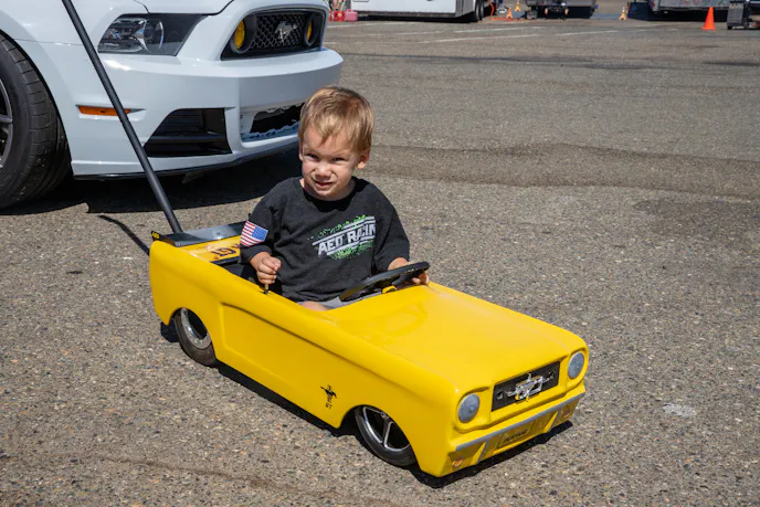 Andres Serrano’s 1986 Ford Mustang is hiding a Gen 2 Coyote under the hood that’s good for 443 horsepower and 399 lb-ft at the wheels, and has been a best of 12.2 at 119 mph. It’s backed by a TKO600 transmission and up front it uses an AJE K-member, UPR coilovers, Maximum Motorsports caster-camber plates, and out back it has Maximum Motorsports lower control arms, Baseline upper control arms, Drag springs, Strange 10-way adjustable shocks and a UPR anti rollbar. Dark Shadow Grey (DSG) 2003 and 2004 Mustang Cobras are rare, but you wouldn’t know it walking the show, as some of the best Terminator Cobras just happened to be DSG! Elveen Lala’s example was one such example with an effective combo of show and go parts. The lineup included a smaller blower pulley, Metco idlers, a JLT CAI, an Afco heat-exchanger, MGW shifter, Centerforce clutch, Billetflow IRS brace, Bassani x-pipe, Magnaflow Magnapack, Willwood brakes, Koni adjustable shocks, Eibach springs, Maximum Motorsports IRS rearend bushings, 18-inch Forgestar wheels, carbon fiber throughout, and an AED tune good for 482 horsepower and 504 lb-ft at the wheels.People of all ages enjoyed the day of horsepower, burnouts, shiny paint and gearhead camaraderie, even the soon-to-be-racers like Cole!Eddie Rachel’s turbocharged classic Mustang was an absolute beast all day, unloading the front tires at the hit and pulling like a freight train on the big-end!