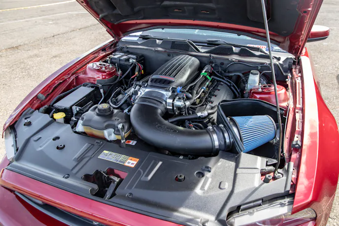 Rafael Perez’s 2003 Cobra has been this modded and flawlessly clean for years now. In fact, some might say he’s an OG of the California Terminator Cobra scene. For those unfamiliar with his DSG Cobra, it makes 630 horsepower and 539 lb-ft at the wheels thanks to a Whipple Gen 2 2.3L blower, an Accufab throttle body, Metco pulleys, Bassani headers and X-pipe, polished Borla Stingers, and an Afco heat exchanger. Other important bits include an MGW shifter, McLeod RXT clutch, Full Tilt Boogie IRS parts, True Forged coolant tanks, 18-inch CCW wheels, and Yukes projector headlights.