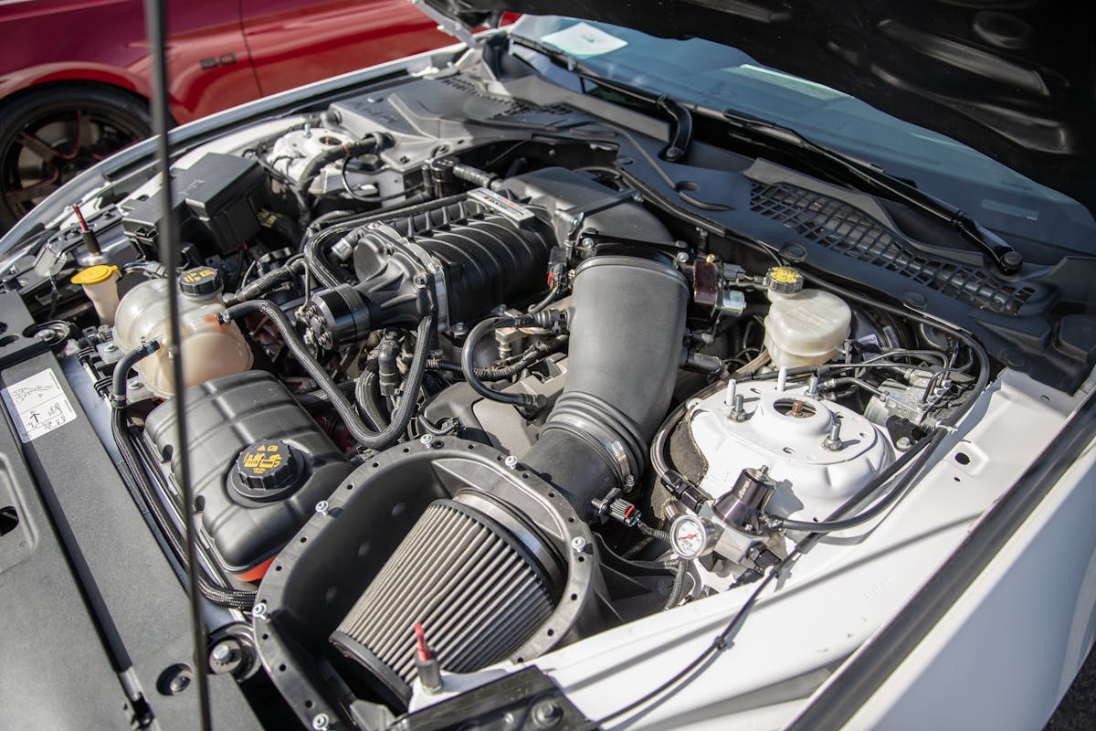 Rafael Perez’s 2003 Cobra has been this modded and flawlessly clean for years now. In fact, some might say he’s an OG of the California Terminator Cobra scene. For those unfamiliar with his DSG Cobra, it makes 630 horsepower and 539 lb-ft at the wheels thanks to a Whipple Gen 2 2.3L blower, an Accufab throttle body, Metco pulleys, Bassani headers and X-pipe, polished Borla Stingers, and an Afco heat exchanger. Other important bits include an MGW shifter, McLeod RXT clutch, Full Tilt Boogie IRS parts, True Forged coolant tanks, 18-inch CCW wheels, and Yukes projector headlights.