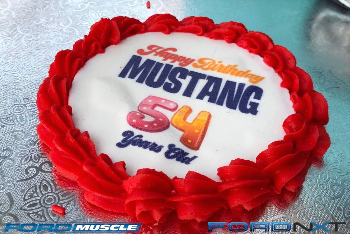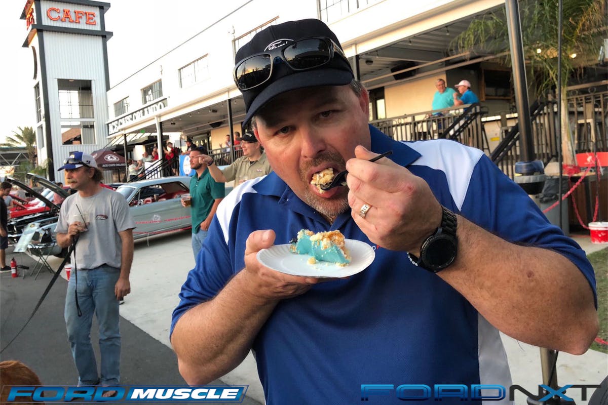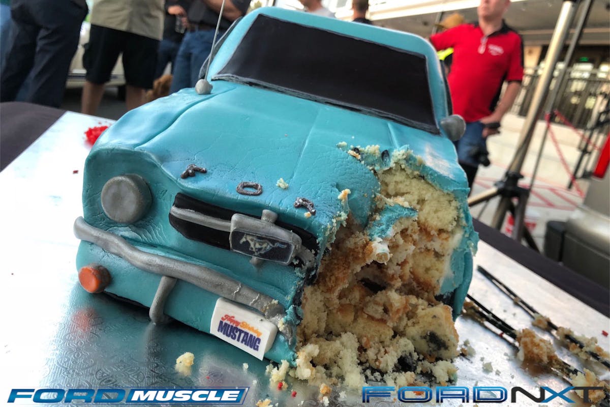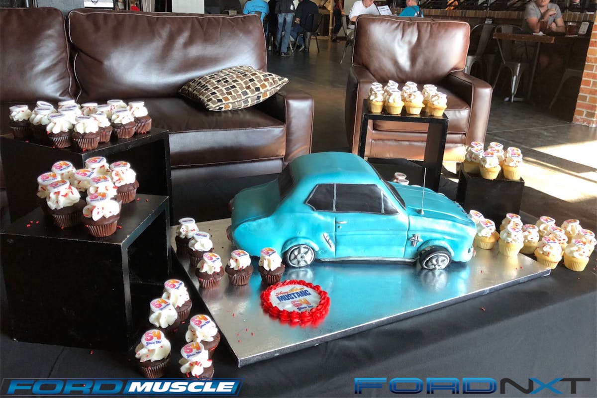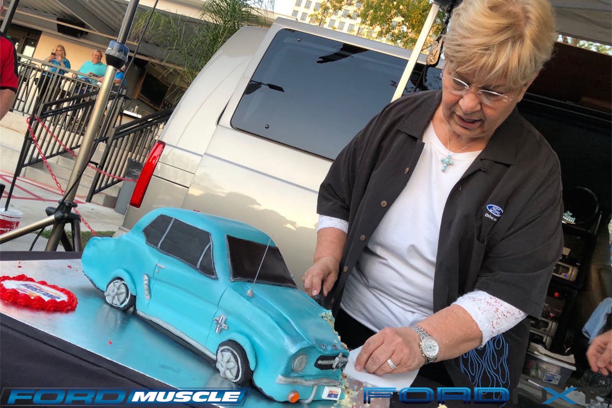 Rick Schmidt of National Parts Depot cut the first slice of the Mustang birthday cake from Jillycakes, and former Mustang Times editor, Mary Jean Wesche served it up to the Mustang fans in attendance.