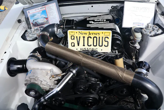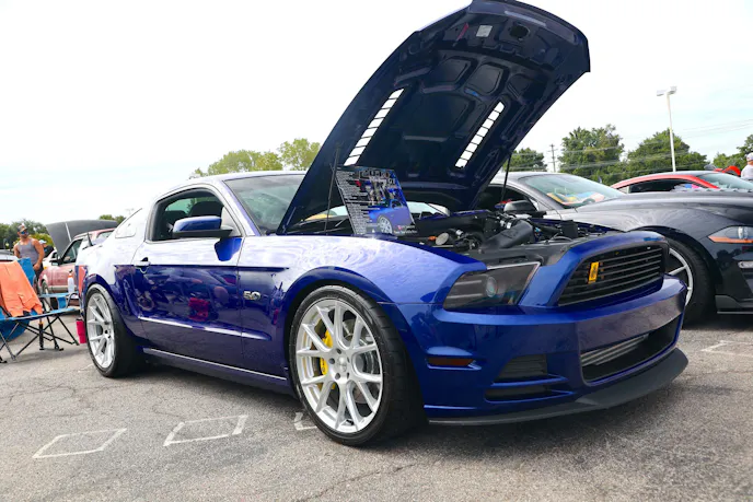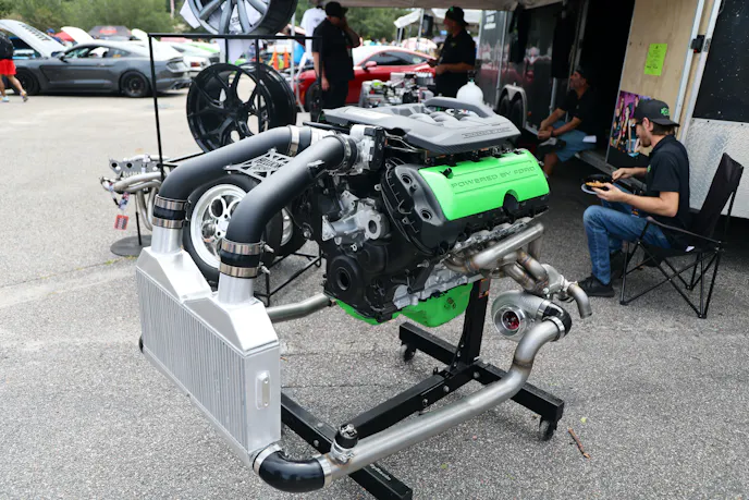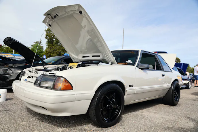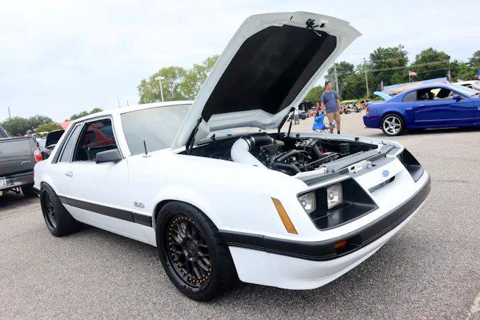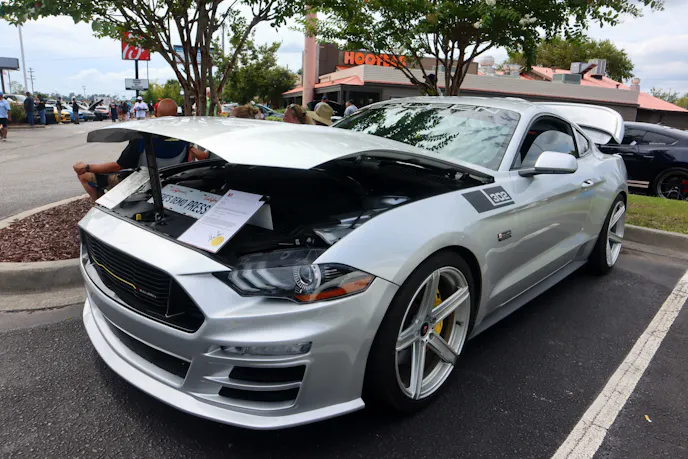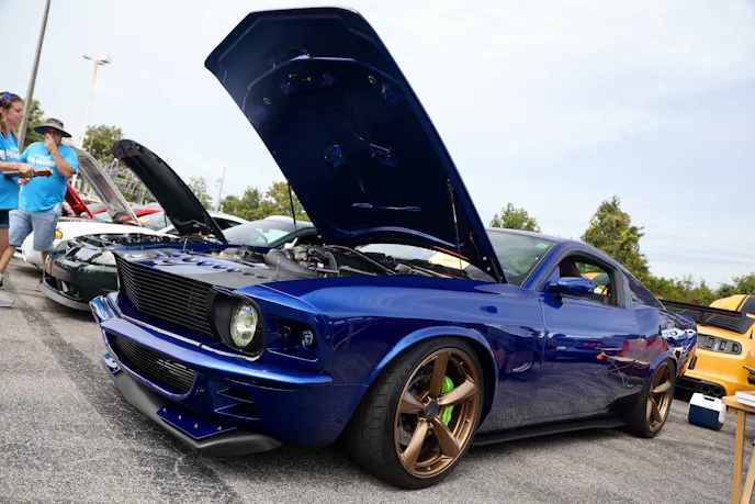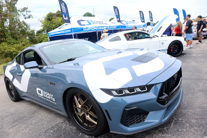 This year’s VIP ticket holders could pick up coffee and doughnuts at the show and under that tent Chad Finchum, Ben Hobson, and Vaughn Gittin Jr. signed posters for the VIPs to take home thanks to Calimer’s Transmissions.Another feature of the official car show and the cruise-in events is a raffle held by event sponsor CJ Pony Parts that benefits the Horry County Animal Shelter. Those purchasing raffle tickets not only help a great cause, but they have the chance to win some impressive products donated by show sponsors and industry supporters.As you might expect, plenty of beautiful rides were on display at the Mustang Week Official Car Show, but one unusual ride was George Muse’s stunning retro mod. Looking every bit the classic pony car on the outside, it is a 2012 Mustang Boss 302 underneath. It functions just as it did from the factory, right down to the Track Key, but it was converted to appear as a classic Mustang by Duncan Brothers.Blow-By Racing, which sponsored Tuesday’s All-Mustang Meet-Up, used its display as the background for the public debut of Hellion Turbo’s system for the 2024 Mustang GT and Dark Horse. When the cars can be tuned, this system is ready to deliver big boost to the factory’s dual-throttle body intake.