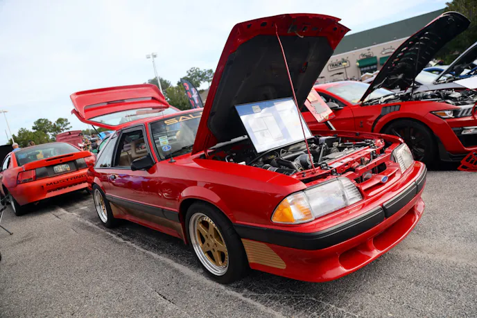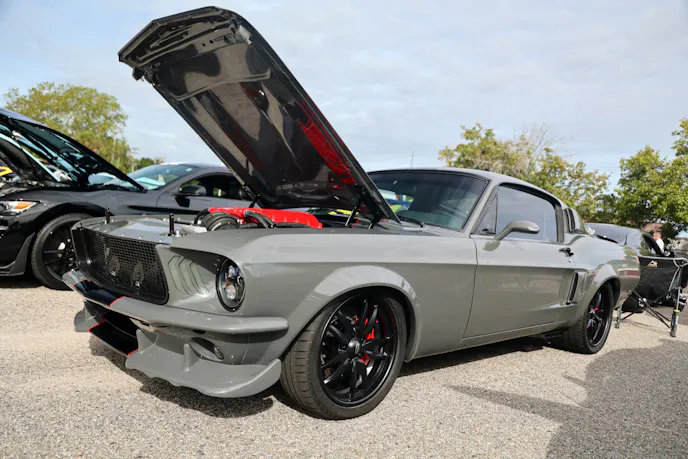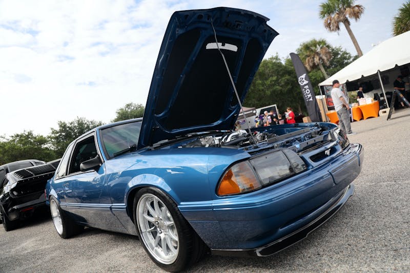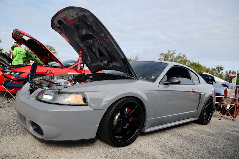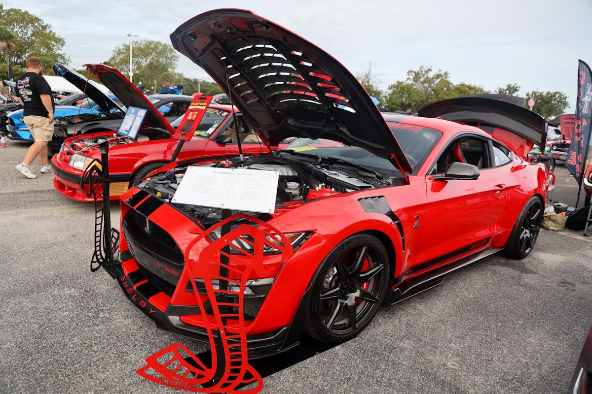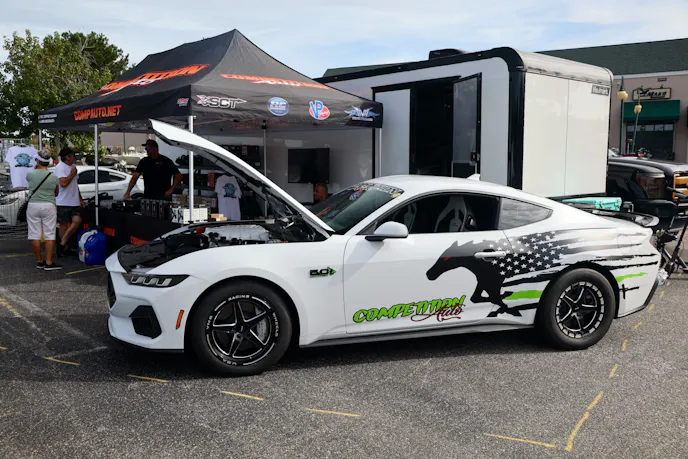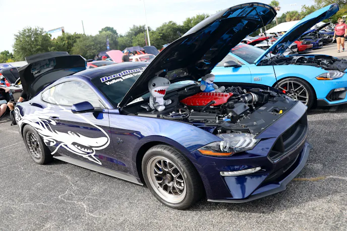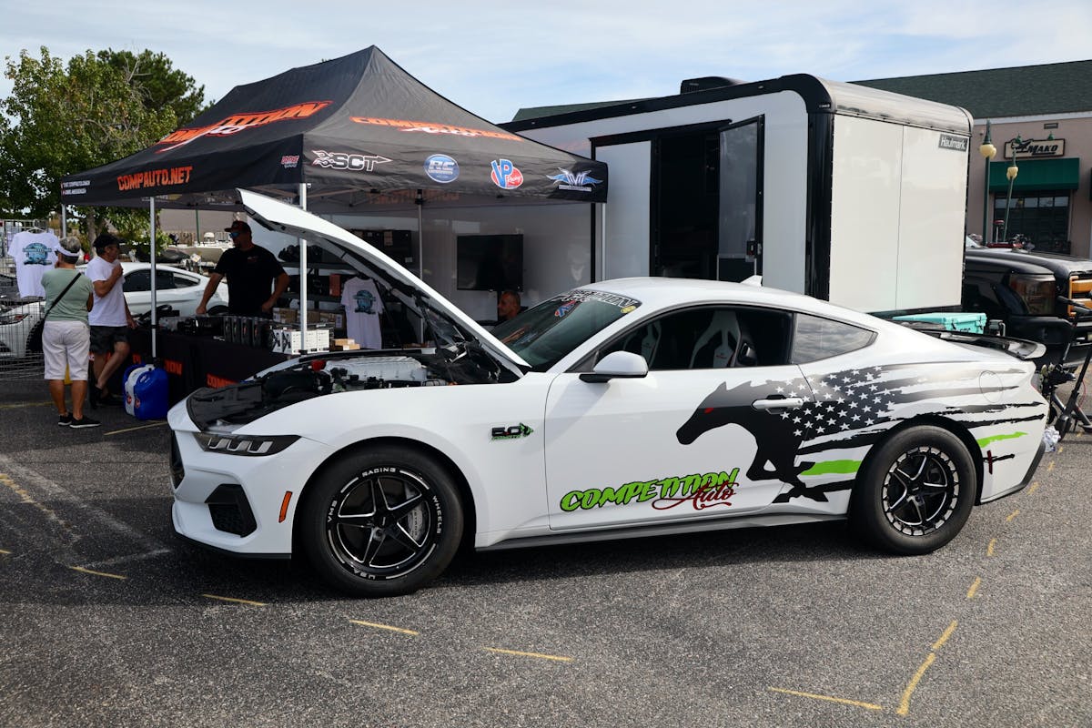This year’s VIP ticket holders could pick up coffee and doughnuts at the show and under that tent Chad Finchum, Ben Hobson, and Vaughn Gittin Jr. signed posters for the VIPs to take home thanks to Calimer’s Transmissions.Another feature of the official car show and the cruise-in events is a raffle held by event sponsor CJ Pony Parts that benefits the Horry County Animal Shelter. Those purchasing raffle tickets not only help a great cause, but they have the chance to win some impressive products donated by show sponsors and industry supporters.As you might expect, plenty of beautiful rides were on display at the Mustang Week Official Car Show, but one unusual ride was George Muse’s stunning retro mod. Looking every bit the classic pony car on the outside, it is a 2012 Mustang Boss 302 underneath. It functions just as it did from the factory, right down to the Track Key, but it was converted to appear as a classic Mustang by Duncan Brothers.Blow-By Racing, which sponsored Tuesday’s All-Mustang Meet-Up, used its display as the background for the public debut of Hellion Turbo’s system for the 2024 Mustang GT and Dark Horse. When the cars can be tuned, this system is ready to deliver big boost to the factory’s dual-throttle body intake.