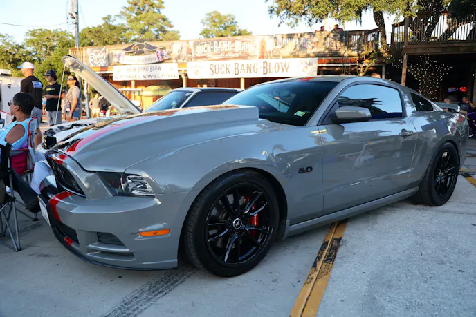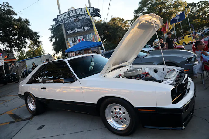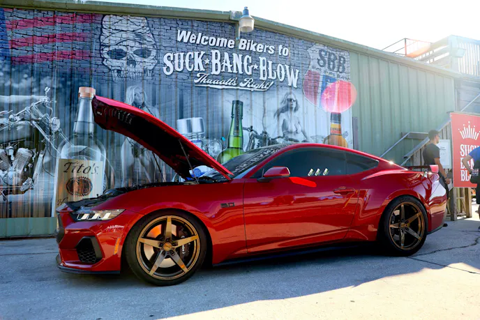 A steady stream of pony cars from all generations filled the parking lot of the infamous Suck Bang Blow biker bar in Murrell’s Inlet, South Carolina. This 40,000-sq-ft facility is known for hosting big events and served as the ideal spot for the All-Mustang Meet-Up presented by Blow-By Racing, which marked the second day of Mustang Week presented by Ford and CJ Pony Parts.