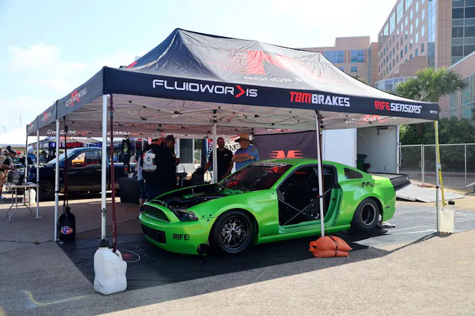 The sound of whirring tires and revving exhausts wasn’t limited to the chassis dyno. For the first time, Ford Motor Company brought its Mustang Unleashed experience to a Mustang Week event. In this high-performance pop-up, attendees could not only learn about the latest Mustangs but also sign up for ride-alongs in one of two S650s. Mustang GT and Dark Horse stallions slid around the Burnyard drift pad all day as Mustang fans learned what these cars can do right off the showroom floor, while the RTR drift demonstrators took the tire-slaying action to the next level.