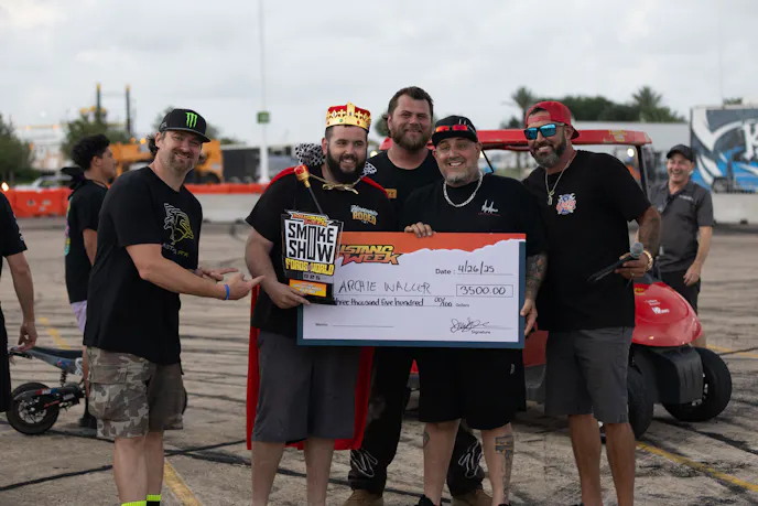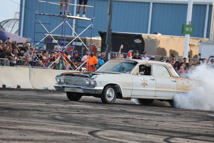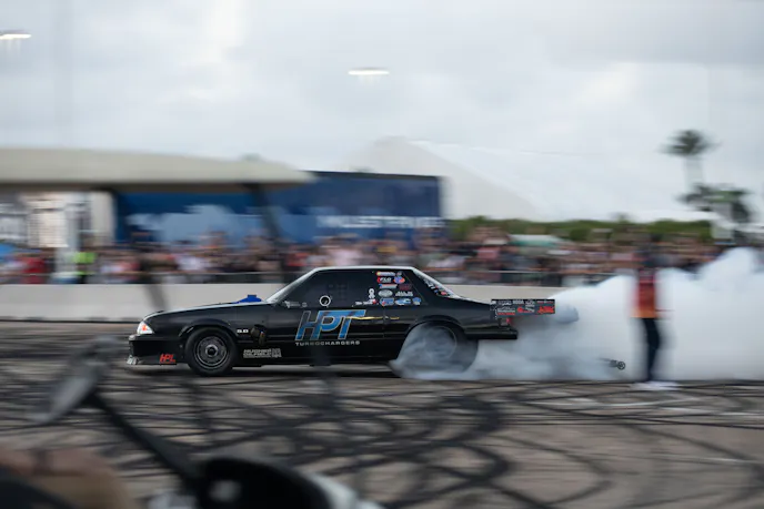 Just before the sun set, drag racing legend Mike Murillo entered the ring with his 3,500-plus-horsepower big-block, twin-turbo Fox Mustang to grace the fans with a few burnouts of his own. Given that Mike’s Fox is set up to do quite the opposite, his burnouts were quick. However, the display of force offered the crowd a chance to see his legendary Mustang in action.