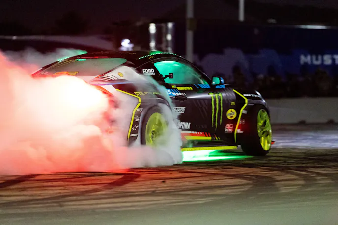 Once dyno awards wrapped up, the glorious sounds of supercharged Coyotes roared back to life in the drift zone. Behind the wheel were Formula Drift pros Vaughn Gittin Jr. and Ben Hobson from the RTR drift team in their 2025 Mustang RTR demonstrators for the Drifting Exhibition. Showcasing their extreme car control, the duo put on quite the show, sliding in tandem just centimeters apart from each other around the drift zone.