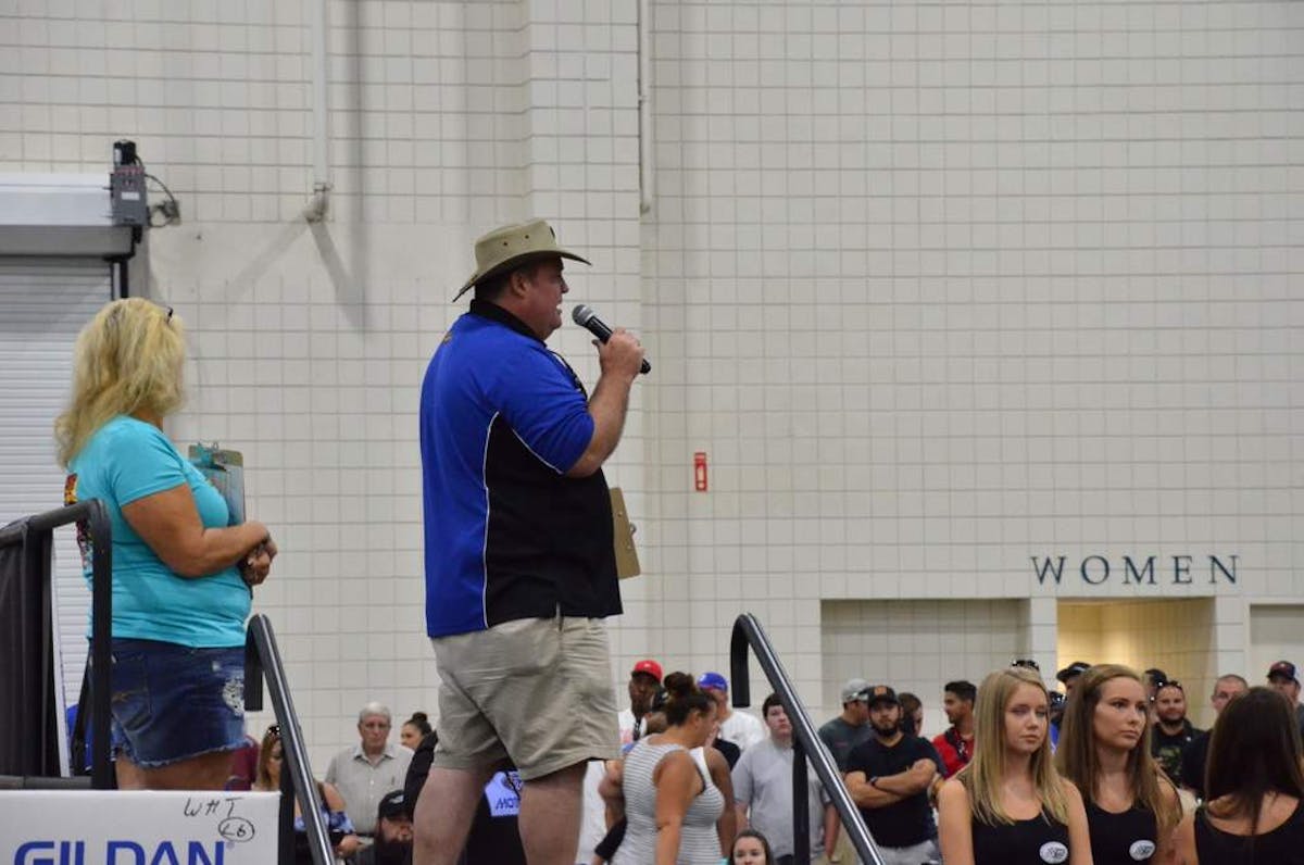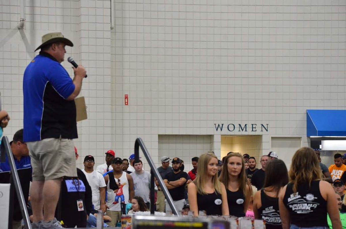 Mustang Week Staff Members Mike Clay and Brad Worley address the crowd (top). A sampling of the popular Mustang Week Raffle 2017 giveaway items (bottom).