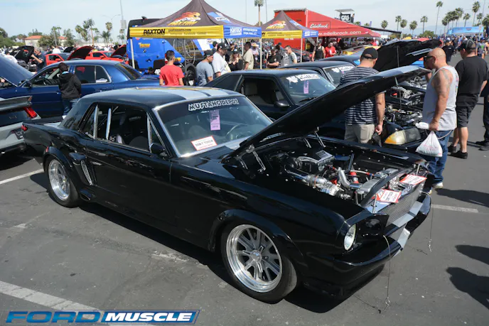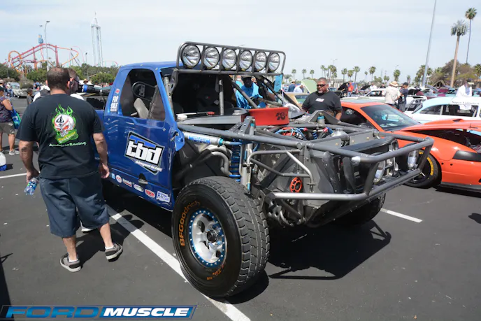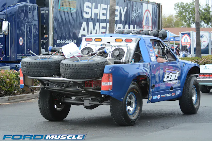 At Knott’s more for sale than show, this burly Class-8/pre-runner was all-new — and the first of its breed we recall seeing at Fab Fords. Big-inch Clevors are typical in this class; this one was wearing a 442-inch dry-sumped thumper from Patton Racing Engines. Rated at 720 horsepower, it heats a Mogi C6 trans and Chrisman 9-inch. Chassis and suspension were gleaming new; the whole thing rolls on 17-inch wheels and 37-inch tires. We’re glad we don’t have to feed the 85-gallon fuel cell. Highlights of the modern pre-Coyote Mustangs at Knotts are the Cobras, Mach 1s, and Bullitts. All are consistently well represented every year, and as we see here Fab Fords likes to mix like-minded cars together, hence the ’68 Highland Green machine standing with the SN95 and S197 Bullitts. Prized as much for their specialty status as their wonderful driving manners, the Bullitts seem to attract more show than go modifications.