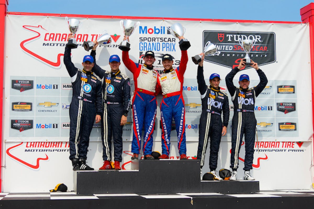 It was the first win of the season for Andy Lally, Matt Bell, and the No. 9 Stevenson Motorsports Camaro Z/28.R (however their teammates Robin Liddell and Andrew Davis have two wins to their credit). Ian James and Billy Johnson rebounded from their disastrous start at Watkins Glen by finishing second at Canadian Tire Motorsports Park in the No. 158 Multimatic Motorsports Mustang BOSS 302R. Their teammates Jade Buford and Scott Maxwell finished third.